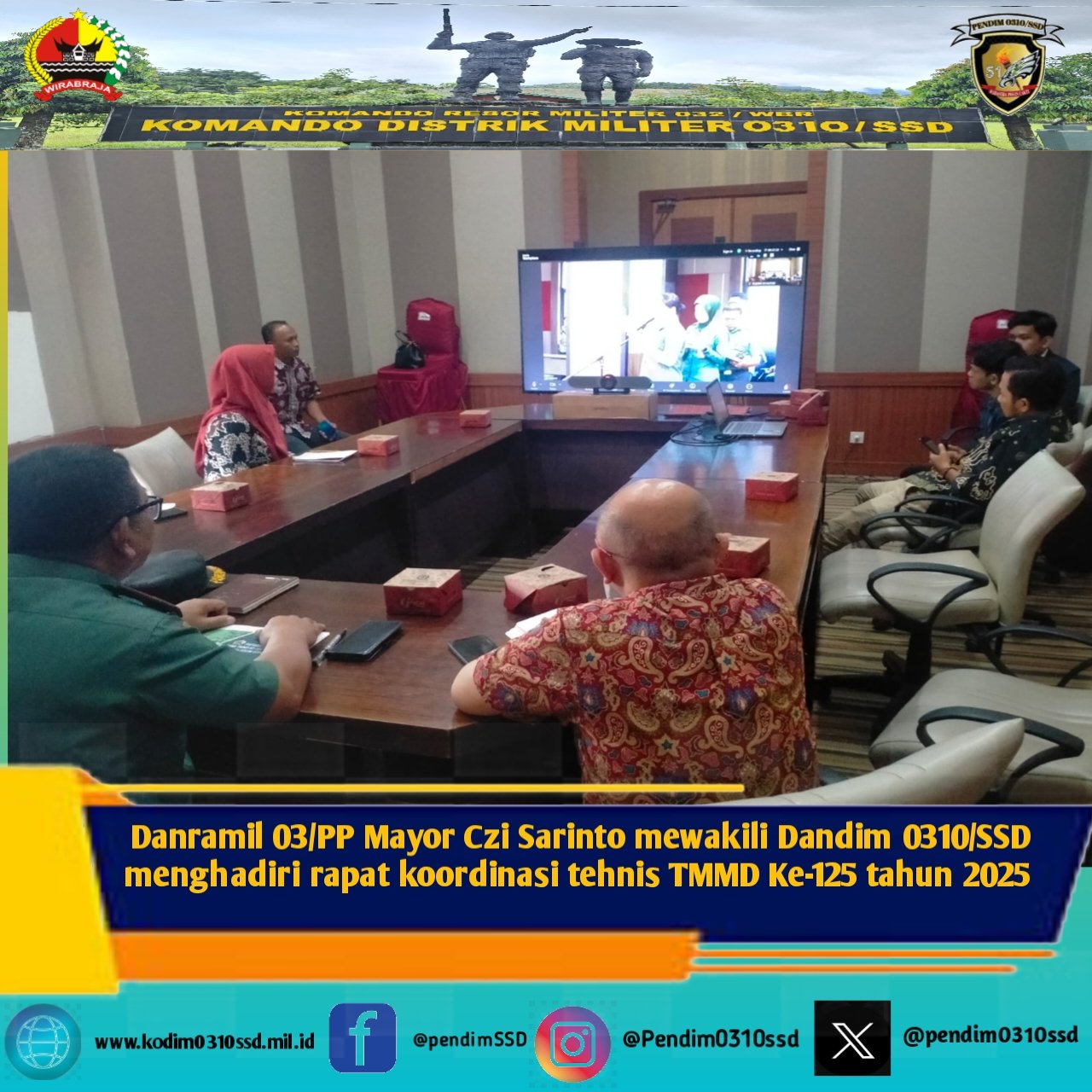 Danramil 03/PP Mayor Czi Sarinto mewakili Dandim 0310/SSD menghadiri rapat koordinasi tehnis TMMD Ke-125 tahun 2025Danramil 03/PP Mayor Czi Sarinto mewakili Dandim 0310/SSD menghadiri rapat koordinasi tehnis TMMD Ke-125 tahun 2025 Danramil 03/PP Mayor Czi Sarinto mewakili Dandim 0310/SSD menghadiri rapat koordinasi tehnis TMMD Ke-125 tahun 2025 yg dipimpin oleh waater KASAD secara tatap muka dan Vedio Conferent di Kodim 0310/SSD (Ruang rapat Pemkab. Dharmasraya), Kamis (10-07-2025)