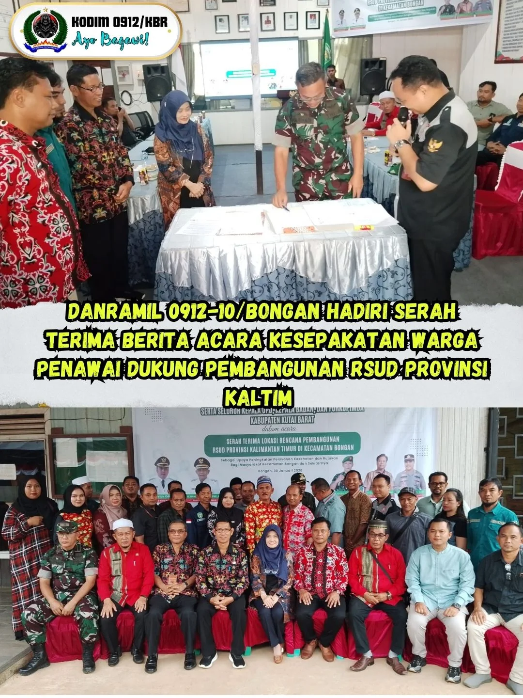 Kutai Barat – Pada Jumat, 30 Januari 2026, Danramil 0912-10/Bongan, Kapten Inf Hariyadi, hadir dalam acara serah terima berita acara kesepakatan antara masyarakat Kampung Penawai dan Pemerintah Provinsi Kalimantan Timur. Acara ini digelar di Kantor Kepala Kampung Penawai pada pukul 09.00 WITA dan bertujuan untuk mendukung rencana pembangunan Rumah Sakit Umum Daerah (RSUD) di Kecamatan Bongan.