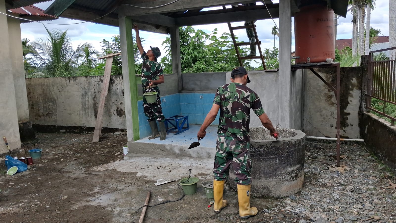 Personel Satgas TMMD melaksanakan pengecatan dan pembersihan penampungan air bersih guna memastikan fasilitas tersebut siap digunakan masyarakat dalam jangka panjang.