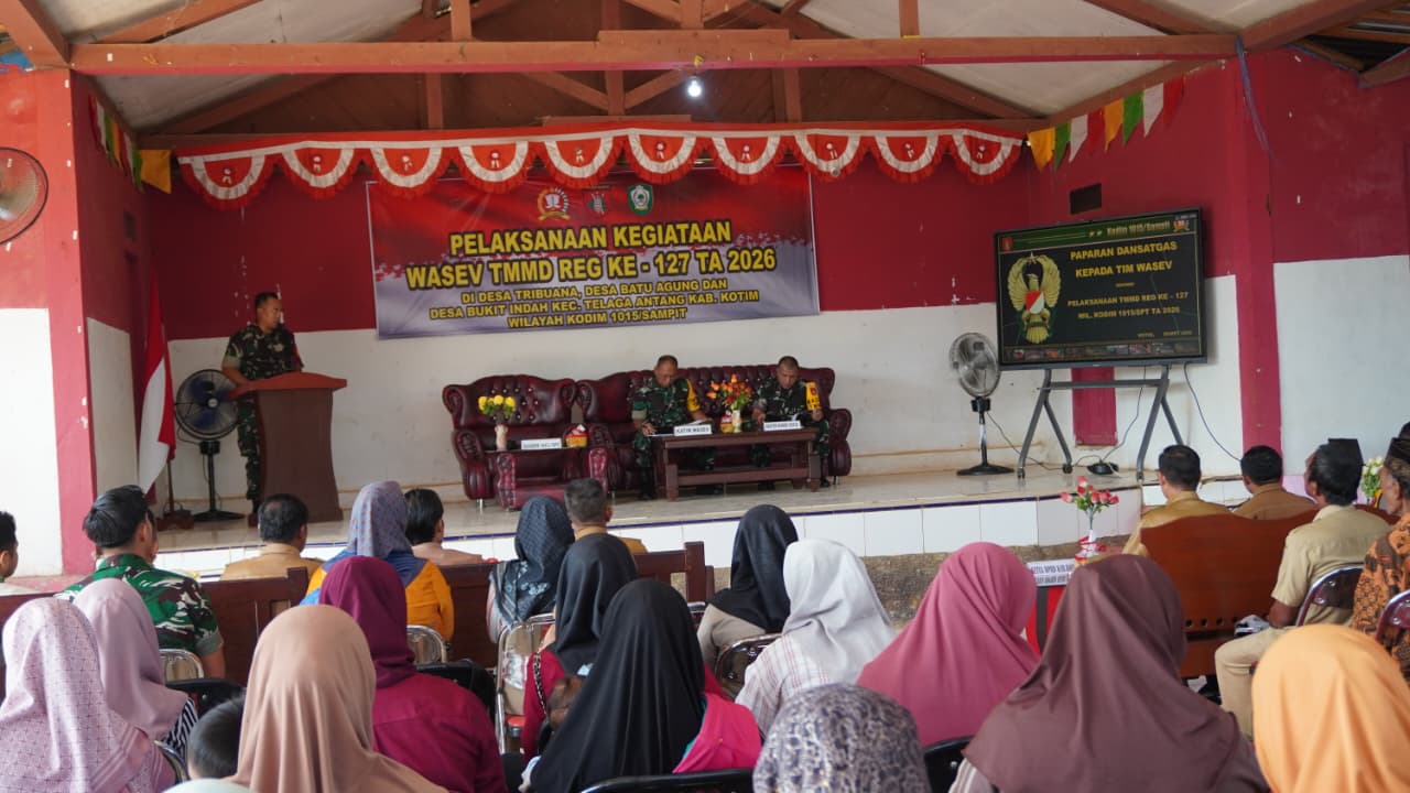 Kotawaringin Timur – Pada Selasa, 3 Maret 2026, Tim Pengawasan dan Evaluasi (Wasev) Mabes Angkatan Darat yang dipimpin oleh Totok Sulistiyono melaksanakan kunjungan kerja di Desa Tri Buana, Kecamatan Telaga Antang, Kabupaten Kotawaringin Timur. Kunjungan ini disambut hangat oleh Dansatgas TMMD ke-127, Letkol Inf Dwi Candra Setyawan, bersamaan dengan unsur Forkopimda setempat, Camat Telaga Antang, Danramil 1015-08/Mentaya Hulu, Pasiter Kodim 1015/Sampit, kepala desa, dan perwakilan tokoh adat serta masyarakat lokal.