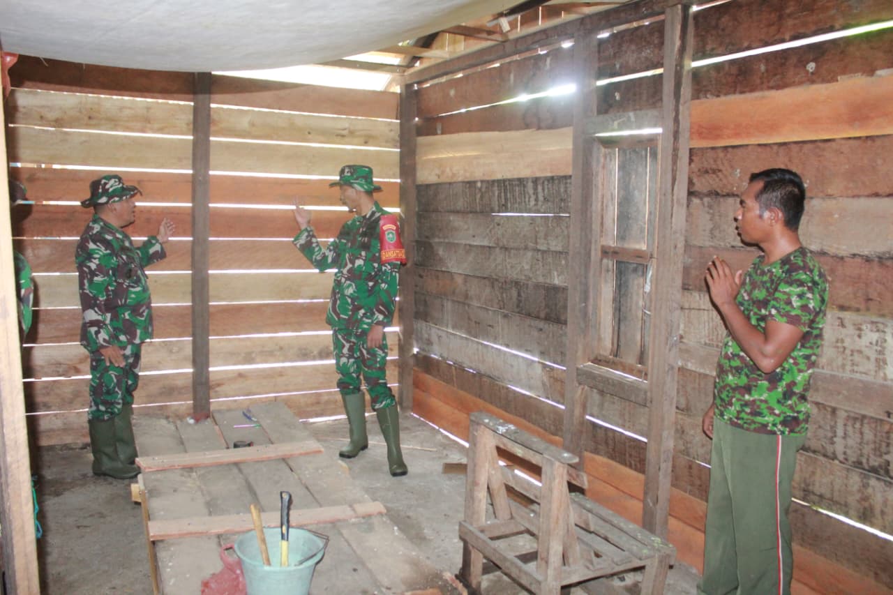 Di dalam rumah kayu yang masih menampakkan rangka dan susunan papan dindingnya, Dansatgas berdiri sambil memberikan arahan kepada anggota Satgas. Cahaya matahari yang menyelinap di sela-sela papan dinding seakan menjadi saksi kesungguhan pengabdian yang sedang berlangsung di dalam bangunan sederhana tersebut.