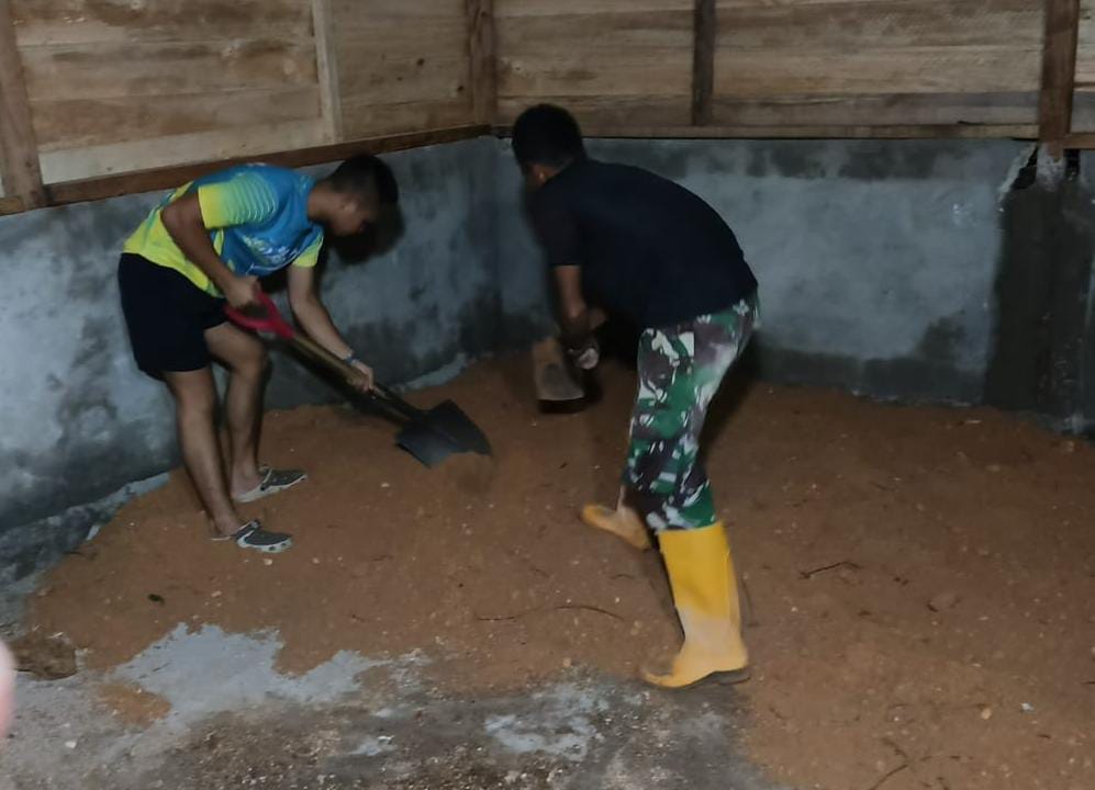 Di bawah cahaya lampu yang terbatas, para prajurit bersama masyarakat setempat tetap bekerja keras untuk menyelesaikan proses pembangunan, terutama pada bagian dinding dan atap, agar tempat tinggal tersebut segera dapat dihuni oleh para penerima manfaat.