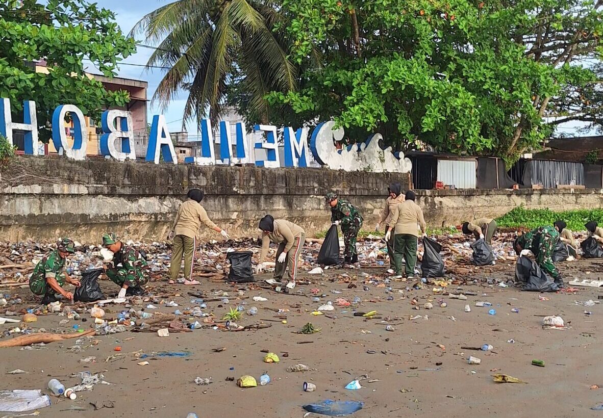 Meulaboh – Wujud kepedulian terhadap kebersihan lingkungan dan kesehatan masyarakat, personel Detasemen Kesehatan Wilayah (Denkesyah) Meulaboh melaksanakan kegiatan pembersihan di kawasan Pantai Pasar Baru Ujung Karang, Meulaboh, Kabupaten Aceh Barat.