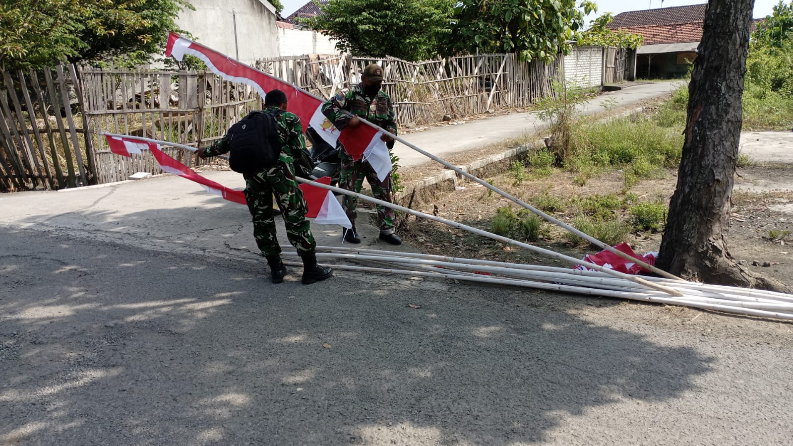 Suasana pagi di desa tersebut dipenuhi dengan riuh rendah suara tawa dan obrolan warga, yang menciptakan keakraban antara masyarakat sipil dan personel TNI. Mereka bekerja sama untuk mengangkut tiang bendera, mengikat tali, dan memastikan bahwa setiap tiang berdiri dengan kokoh.