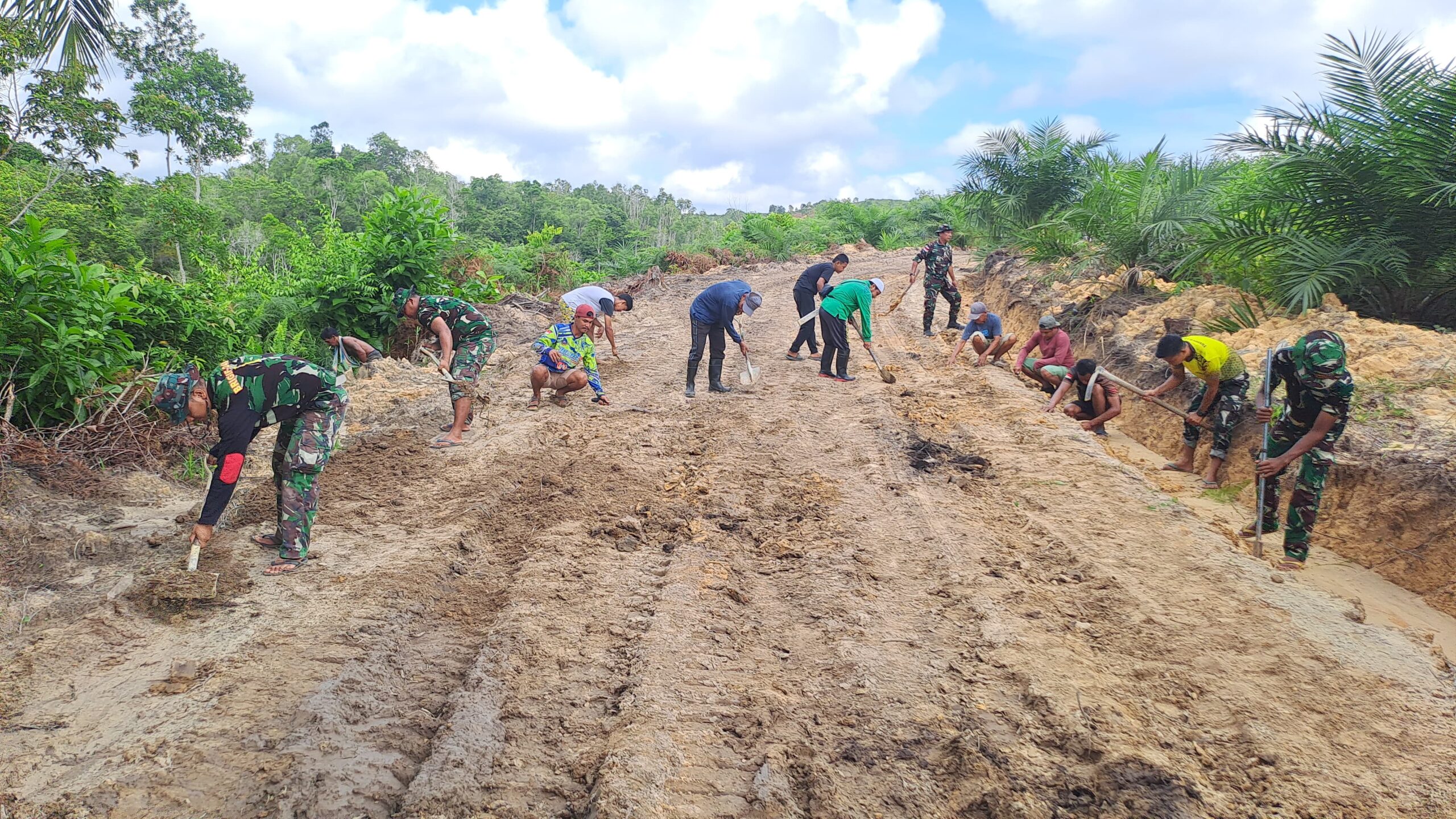 Pemandangan di lokasi tak ubahnya lukisan hidup yang menggetarkan jiwa. Puluhan, bahkan ratusan tangan, dari prajurit berbalut seragam hijau hingga warga sipil yang berlumur keringat, bergerak serentak bagai tarian persatuan yang harmonis. Sekop dan cangkul menjadi tombak, keringat menjadi saksi bisu, namun tak secuil pun keluhan menguar. Justru, di tengah bahang terik dan beban kerja, tawa dan canda bertebaran, mengubah kelelahan menjadi energi, dan kesulitan menjadi inspirasi. Ini adalah bukti nyata bahwa kebersamaan yang tulus mampu meluluhkan segala hambatan, menyulap pekatnya perjuangan menjadi manisnya kebahagiaan.