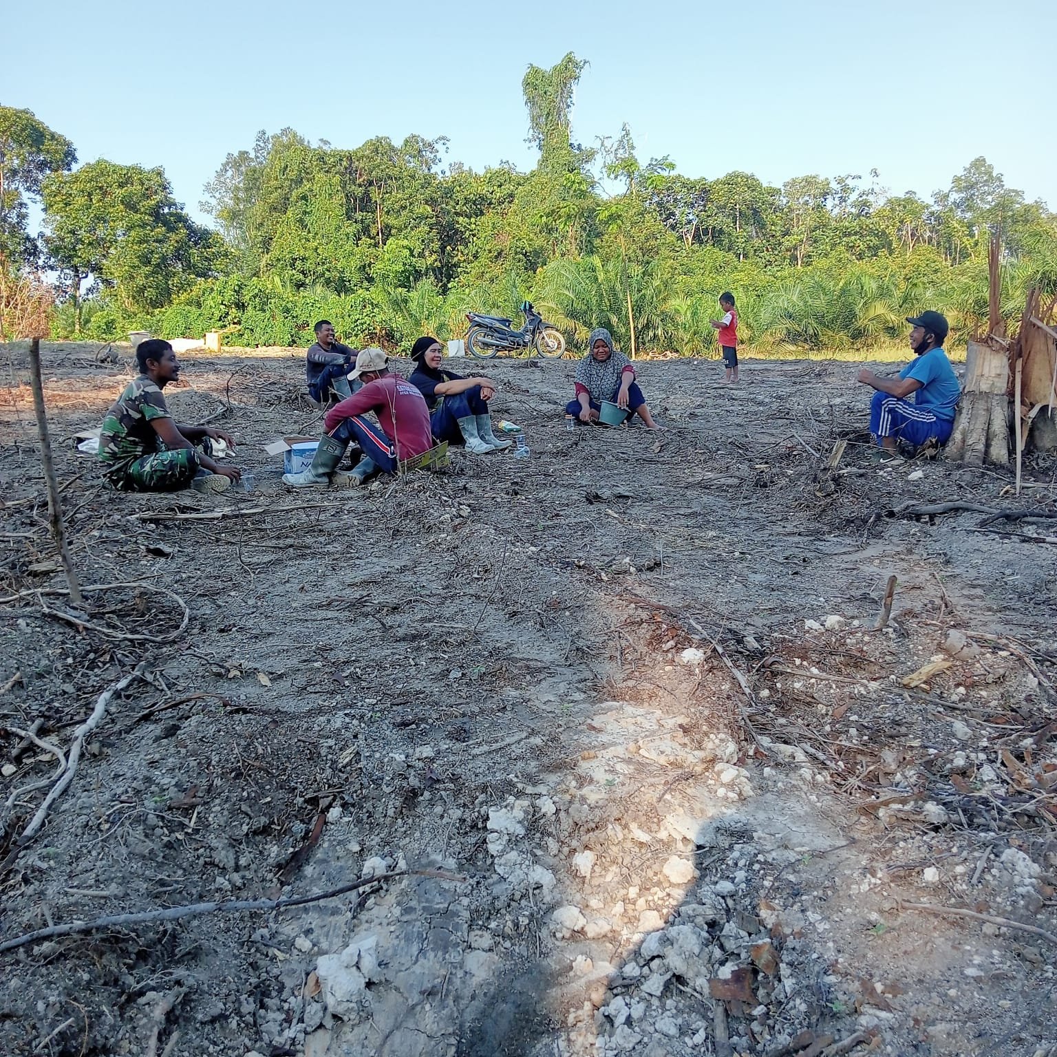 Anggota Satgas TMMD, Sertu Sri Wiyono, memanfaatkan waktu di luar pengerjaan fisik untuk melakukan komunikasi sosial (Komsos) bersama warga. Dalam kesempatan tersebut, ia mengajak masyarakat untuk mengoptimalkan lahan yang ada guna menanam tanaman pangan yang bermanfaat bagi kebutuhan sehari-hari.