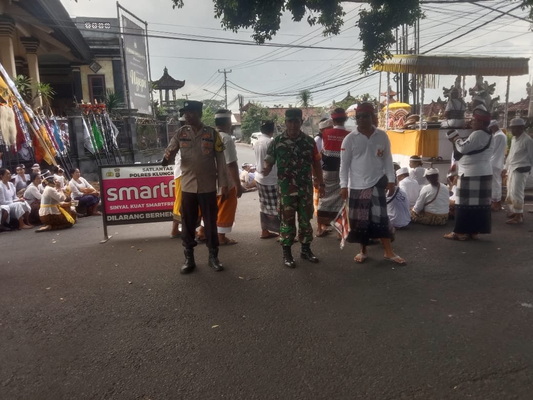 Klungkung,- Babinsa Takmung jajaran Koramil 1610-02/Banjarangkan terjun langsung mengamankan kegiatan upacara keagamaan melasti rangkaian karya mamungkah, pedudusan agung, caru balik sumpah dan numbung pedagingan Pura Pasek Jambot Dusun Takmung Kawan, Desa Takmung, Kecamatan Banjarangkan, kabupaten Klungkung, Senin ( 14/07/25 ).
