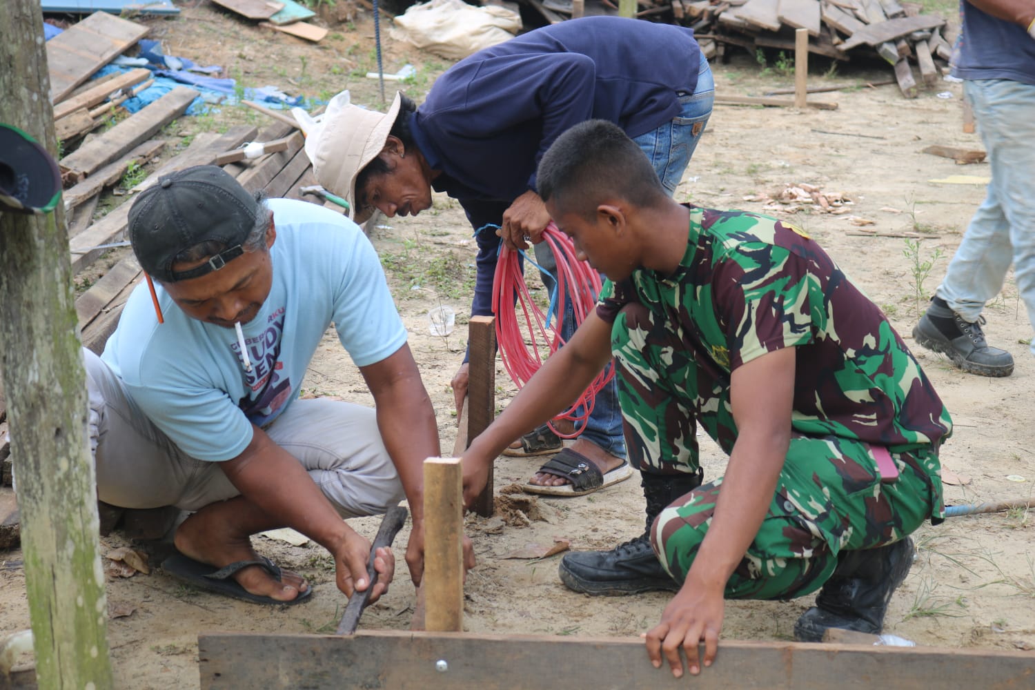 Rumah Rahman, yang kesehariannya diisi dengan membangun hunian bagi orang lain, kini menjadi sasaran empuk kepedulian dan aksi nyata dari para prajurit TNI.