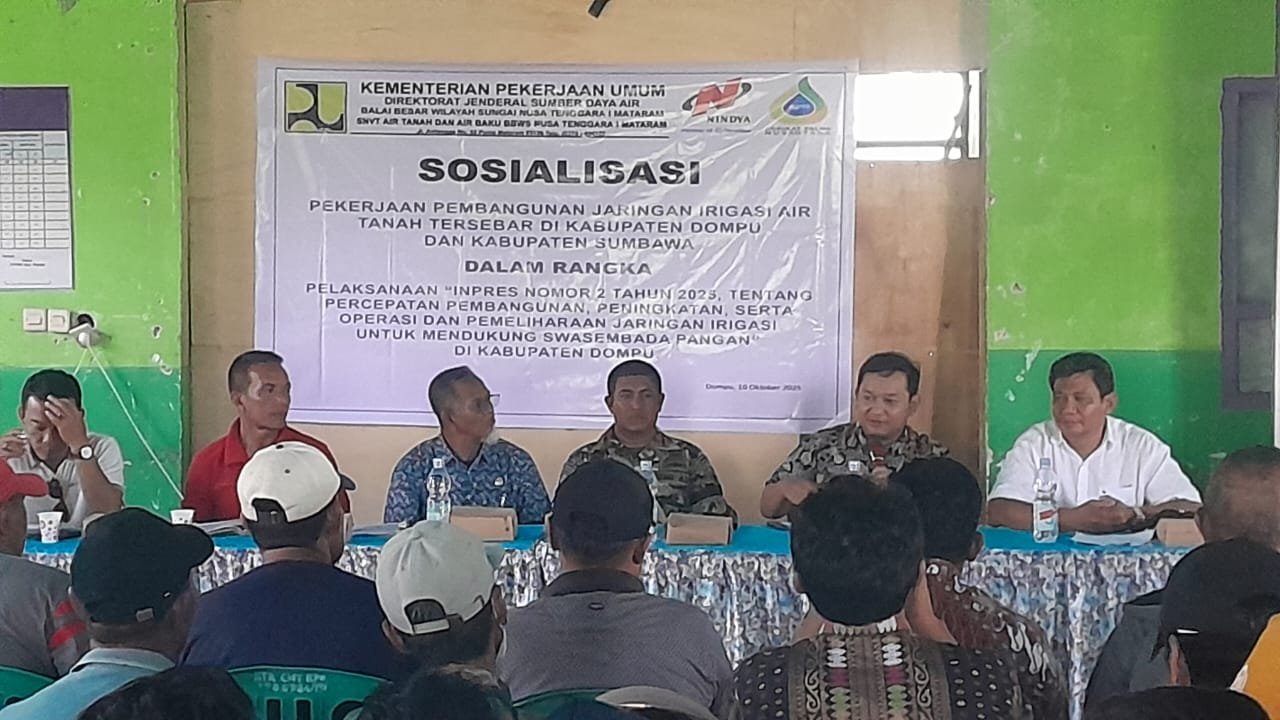 Sosialisasi yang dimulai sekitar 30 peserta dari unsur pemerintah daerah, TNI, Polri, dan masyarakat. Hadir dalam kegiatan antara lain Kadis PUPR Kabupaten Dompu, Kepala Bidang Pembangunan Infrastruktur SDA BBWS Nusa Tenggara I, Kepala Bidang Pelaksanaan BBWS NT I, PPK Pendayagunaan Air Tanah II, Kapolsek Kempo yang diwakili Aipda Syukrin, para camat se-Kabupaten Dompu, kepala desa se-Kecamatan Kempo, perwakilan kelompok tani/P3AT, serta pihak penyedia jasa PT Nindya Karya dan konsultan supervisi PT Agrinas Palma Nusantara.