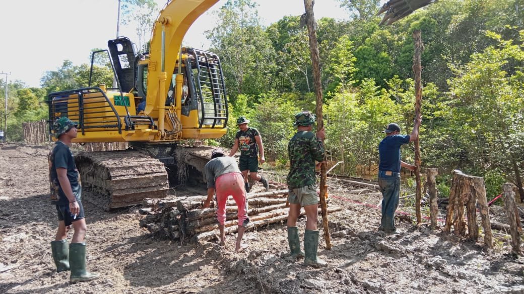 Barito Selatan – Dalam rangka memperkuat struktur jalan yang tengah dibuka pada kegiatan TMMD Kodim 1012/Buntok, kayu cerucuk sepanjang kurang lebih 2 meter mulai ditancapkan ke tanah. Untuk memastikan kayu tertancap dengan dalam dan kuat, Satgas TMMD menggunakan alat berat excavator sebagai penekan kayu tersebut.