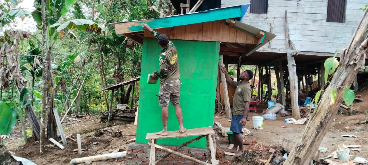 “Kami lakukan pengecatan agar MCK ini tidak hanya fungsional, tapi juga nyaman digunakan warga. Ini bentuk kepedulian kami terhadap kesehatan masyarakat,” ungkap Serda Jhon Yapen.