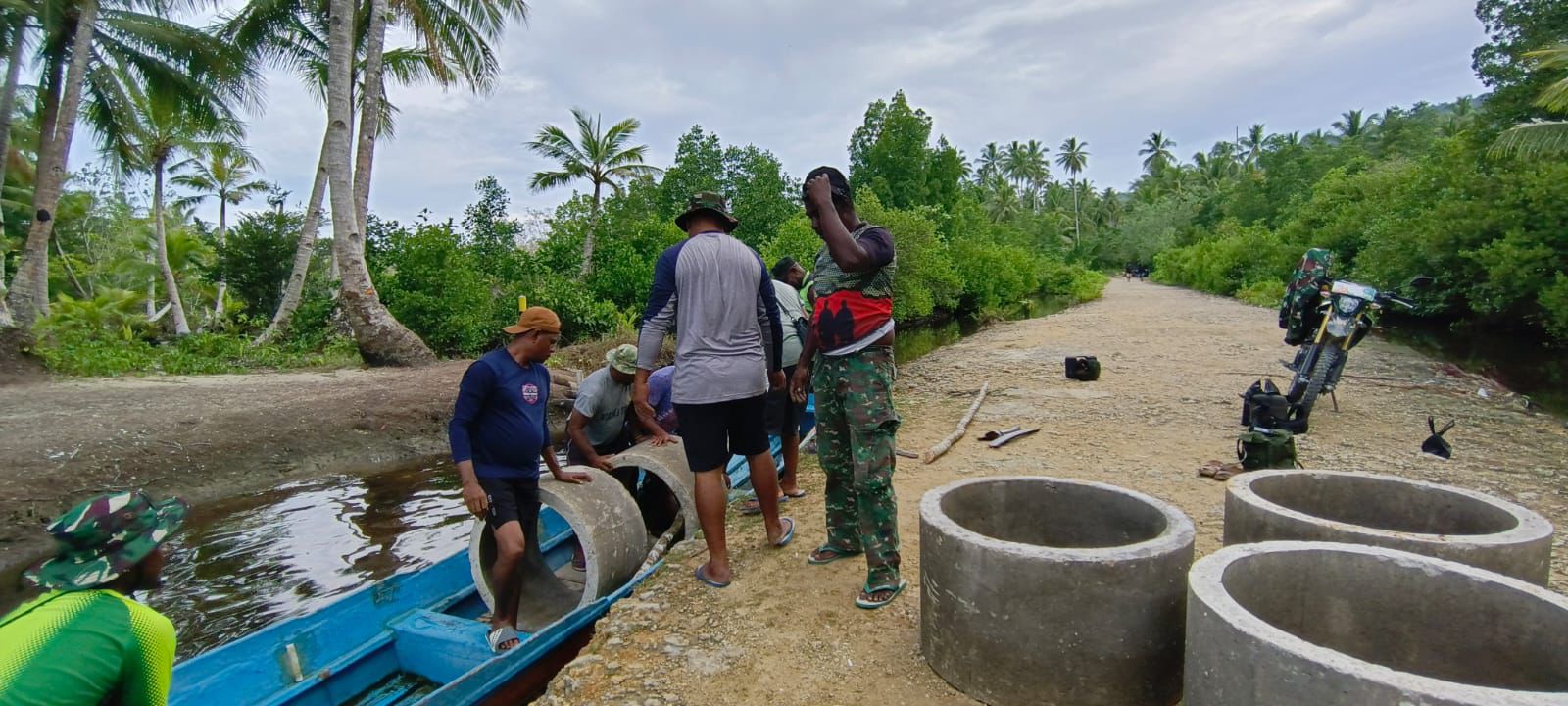 Kegiatan ini dilakukan dengan semangat gotong royong yang tinggi, di mana personel Satgas dan masyarakat bekerja sama dalam mengangkut material yang diperlukan untuk memastikan ketersediaan bahan baku dalam pembangunan sumur bor. Pemindahan material ini tidak hanya menjadi langkah penting tetapi juga strategis untuk mendukung kelancaran pembangunan fasilitas penyedia air bersih bagi warga Kampung Sisir 2.