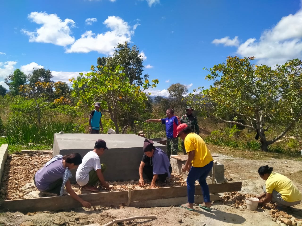 NAEKASA, KODIM 1605/BELU – Semangat gotong royong kembali tercermin dalam pelaksanaan program TNI Manunggal Membangun Desa (TMMD) ke-125 Kodim 1605/Belu di Dusun Baukafena, Desa Naekasa, Kecamatan Tasifeto Barat, Kabupaten Belu. Warga bersama Satgas TMMD bahu-membahu mengerjakan pembangunan dudukan tandon air untuk sumur bor yang menjadi salah satu sasaran fisik tambahan dalam program tersebut.