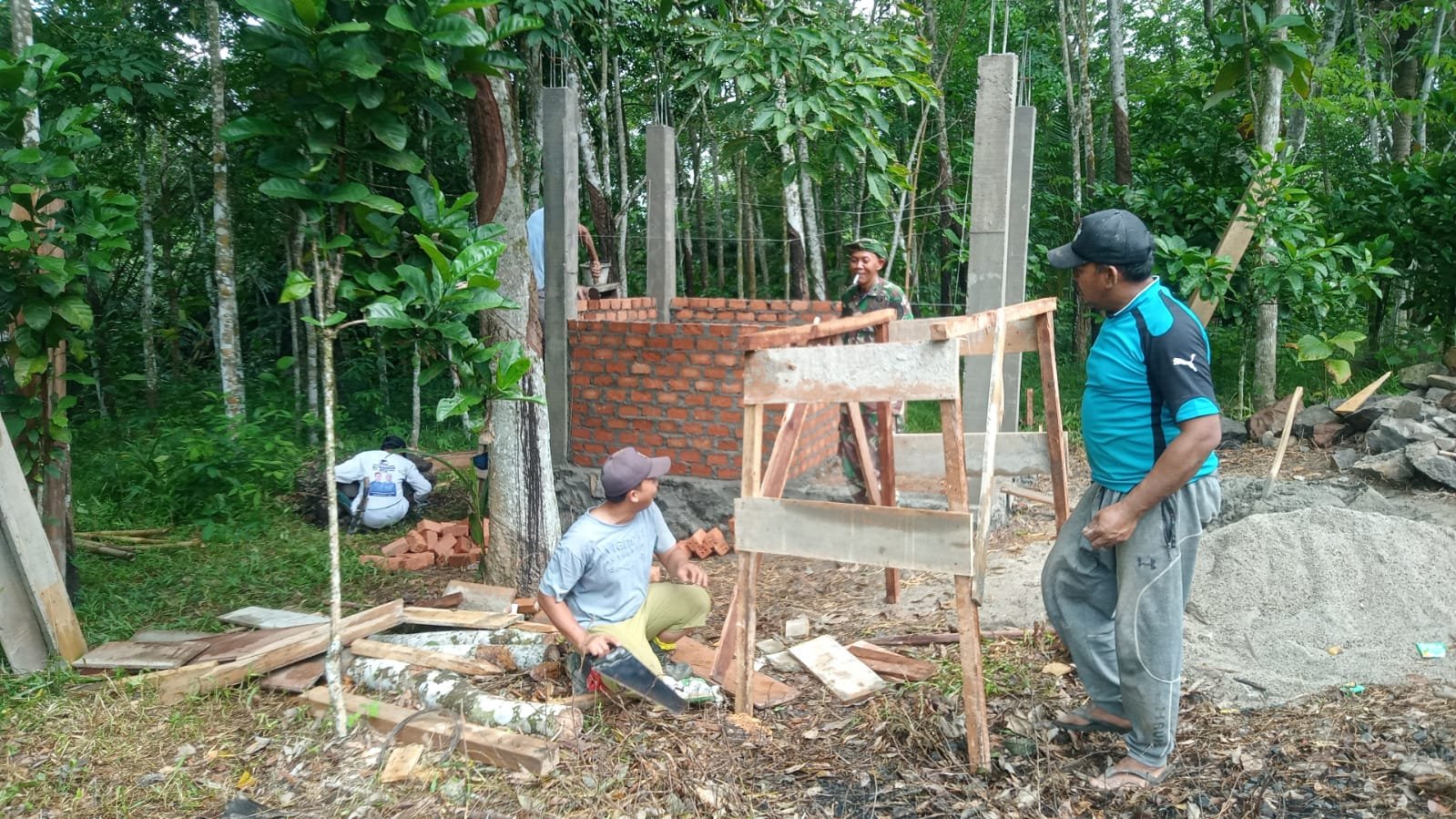Pembangunan yang kini telah mencapai sekitar 20 persen tersebut diawali dengan pekerjaan pemasangan batu bata dan struktur dinding. Meski di tengah teriknya cuaca, semangat kerja sama antara prajurit TNI dan warga tidak surut sedikit pun.