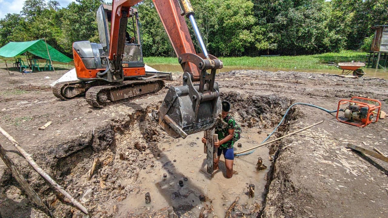 Di lokasi pengerjaan, tampak anggota TNI dan warga bekerja sama dalam mencari dan menyiapkan kayu balokan yang akan digunakan sebagai cerucuk tambahan untuk pondasi jembatan. Aktivitas ini merupakan bagian vital dalam memperkuat struktur dasar pembangunan jembatan agar lebih kokoh dan tahan lama.