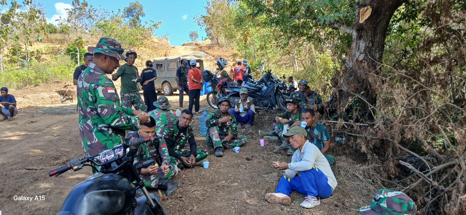 BELU, Senin (28/7/2025) — Di bawah rindangnya pohon asam, anggota Satgas TMMD ke-125 Kodim 1605/Belu dan warga Desa Naekasa menikmati momen sederhana namun penuh makna: istirahat sejenak ditemani secangkir kopi. Kebersamaan ini bukan hanya sekadar melepas lelah, tapi juga mempererat hubungan emosional antara TNI dan masyarakat.