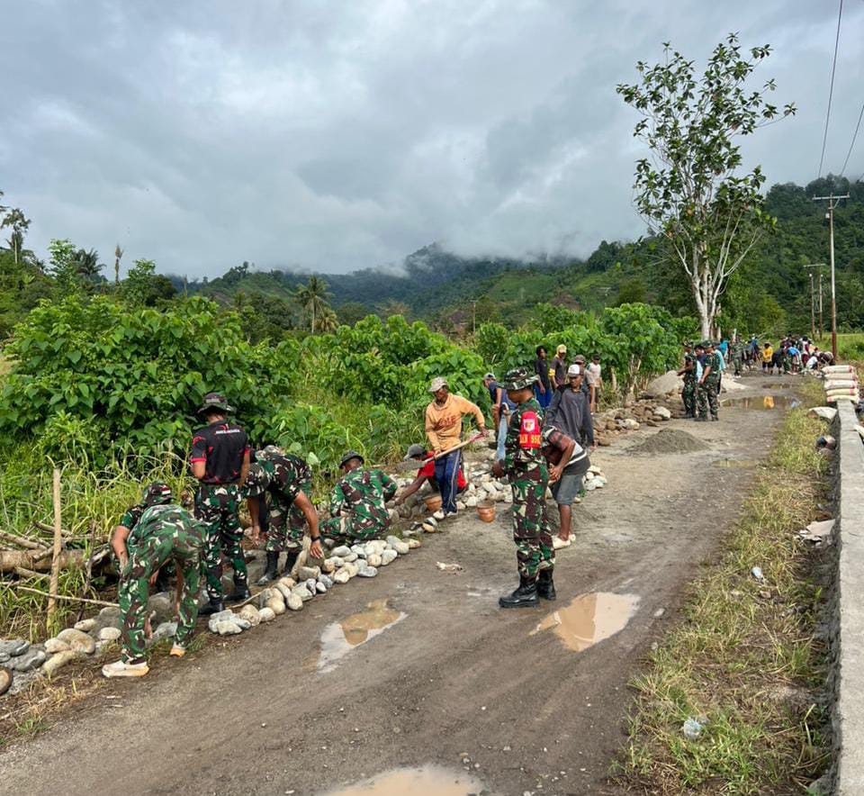 Pelaksanaan kegiatan fisik TMMD ini juga melibatkan partisipasi aktif dari masyarakat setempat yang terlihat bergotong-royong bersama personel Satgas TMMD, mencerminkan kemanunggalan TNI dengan rakyat.