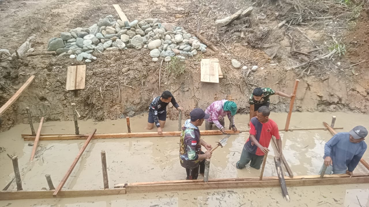 Nagan Raya – Personel yang tergabung dalam Satuan Tugas (Satgas) TMMD ke-127 Kodim 0116/Nagan Raya melaksanakan pemancangan kayu untuk pembuatan box culvert sebagai media penghubung jalan baru dari Desa Ujung Blang ke Desa Pante Ara, Kecamatan Beutong, Kabupaten Nagan Raya, (17/02/2026).