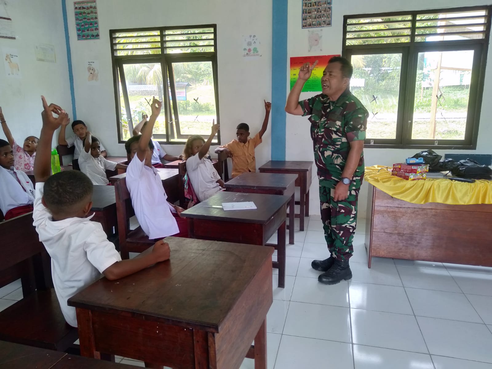 Manokwari Utara, Kamis (30/4/2026) – Dalam rangka membangun karakter generasi muda, Satgas TMMD ke-128 Kodim 1801/Manokwari menggelar program nonfisik di SD Inpres 62 Asai. Program ini menjadi salah satu komitmen TNI untuk meningkatkan kualitas sumber daya manusia khususnya di area pedesaan.