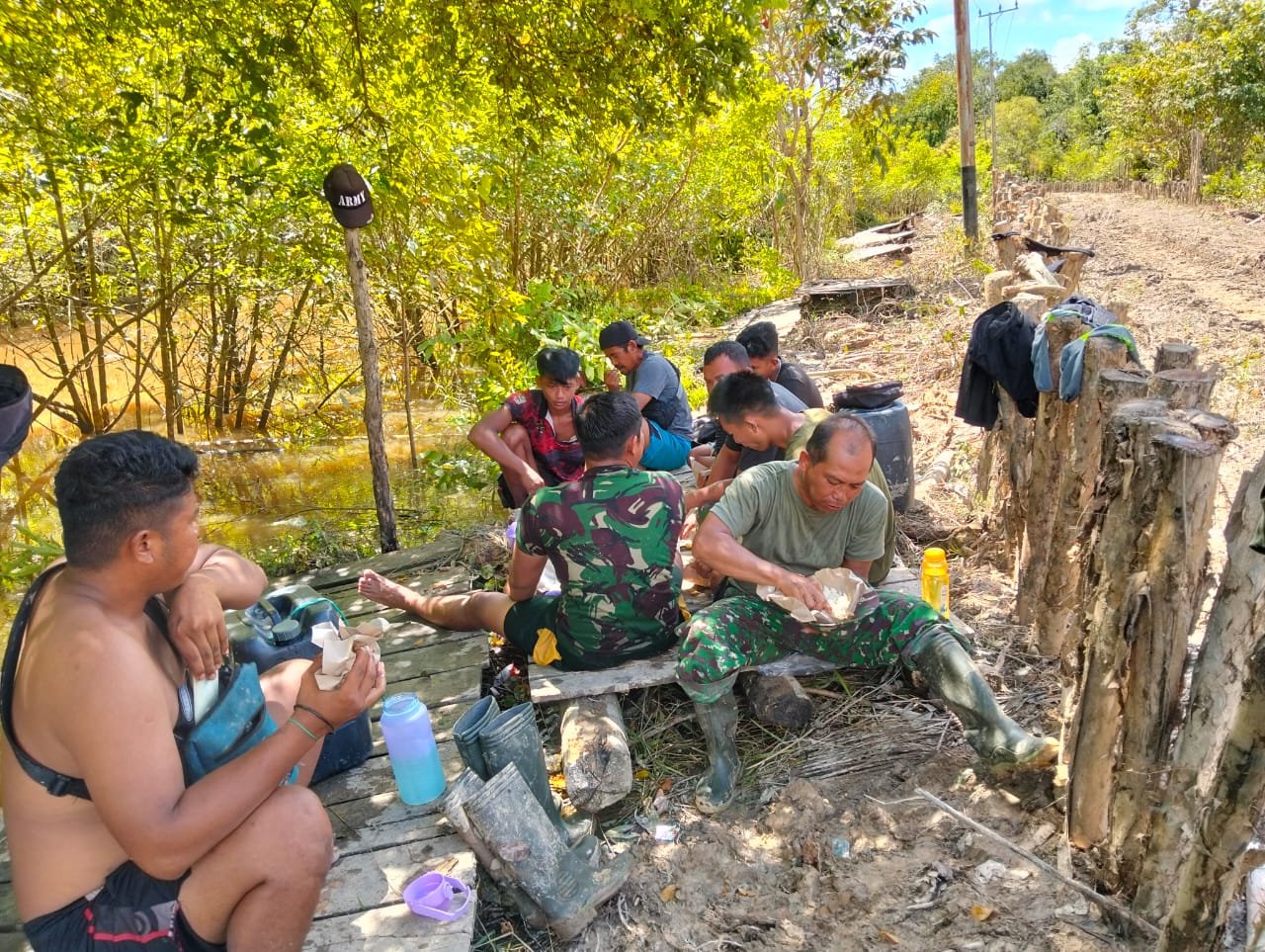 Barito Selatan – Setelah bekerja keras di bawah terik matahari, suasana hangat dan akrab tampak menghiasi lokasi pembukaan badan jalan TMMD Reguler Ke-124 Kodim 1012/Buntok. Anggota Satgas TMMD bersama warga Desa Talio, Kecamatan Karau Kuala, Kabupaten Barito Selatan, tampak bersantai dan bercengkrama di pinggir jalan yang sedang dibuka, Senin (19/05/2025).