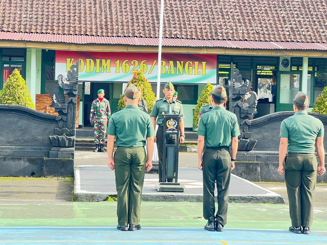 Bangli – Pada Senin, 2 Maret 2026, Kodim 1626/Bangli melaksanakan Upacara Pengibaran Bendera Merah Putih yang diadakan di Lapangan Makodim 1626/Bangli, berlokasi di Jalan Brigjen Ngurah Rai No. 69, Kelurahan Kawan, Kecamatan/Kabupaten Bangli. Upacara ini dipimpin oleh Mayor Inf I Dewa Gede Yudawan selaku Kasdim 1626/Bangli dan bertindak sebagai Inspektur Upacara. Kegiatan tersebut dihadiri oleh seluruh personel TNI dan PNS Kodim 1626/Bangli.
