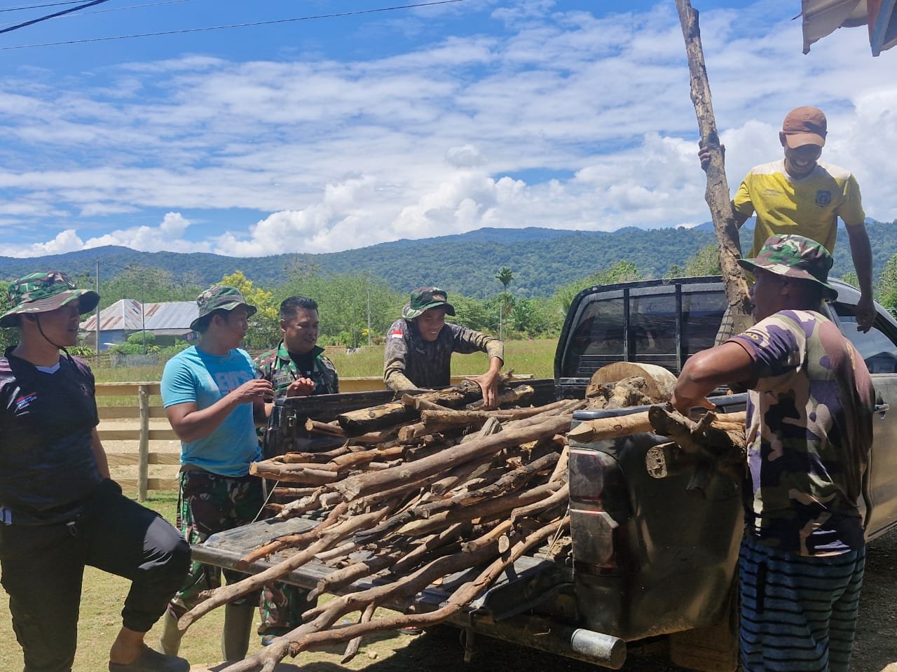 Anggota Satgas TMMD tidak segan ikut turun langsung ke kebun dan sekitar pemukiman warga untuk mencari serta memotong kayu bakar. Kayu-kayu tersebut kemudian dibawa ke dapur umum dan disusun rapi agar siap digunakan untuk memasak.