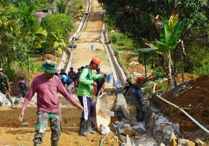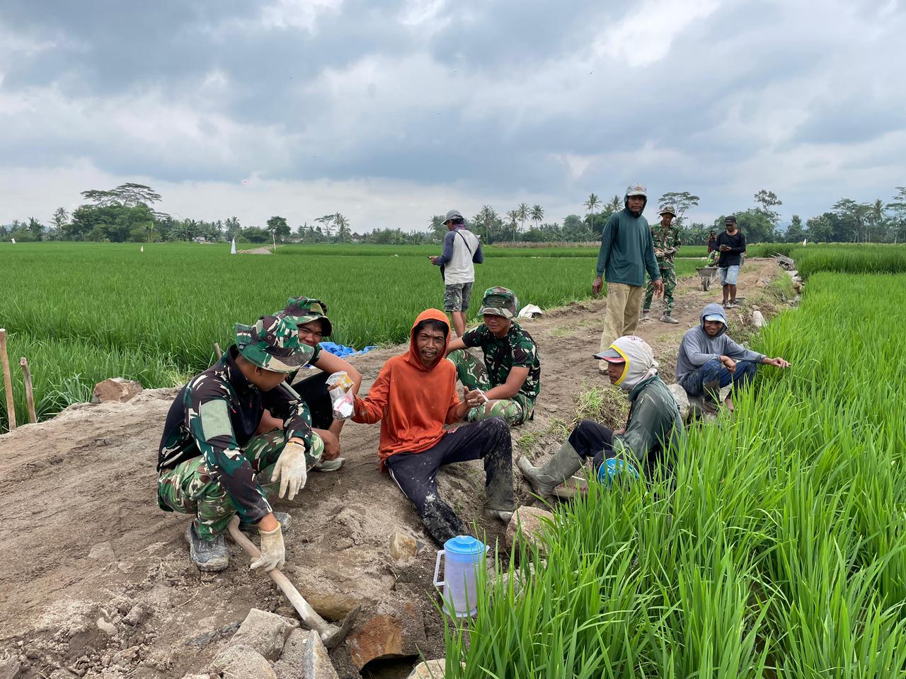 Suasana akrab terbangun di tengah aktivitas pembangunan, di mana warga bersama anggota Satgas TMMD tampak saling bercanda dan bertukar cerita untuk menghilangkan rasa lelah. Momen kebersamaan ini menjadi sumber semangat baru bagi semua pihak yang terlibat dalam pembangunan desa.