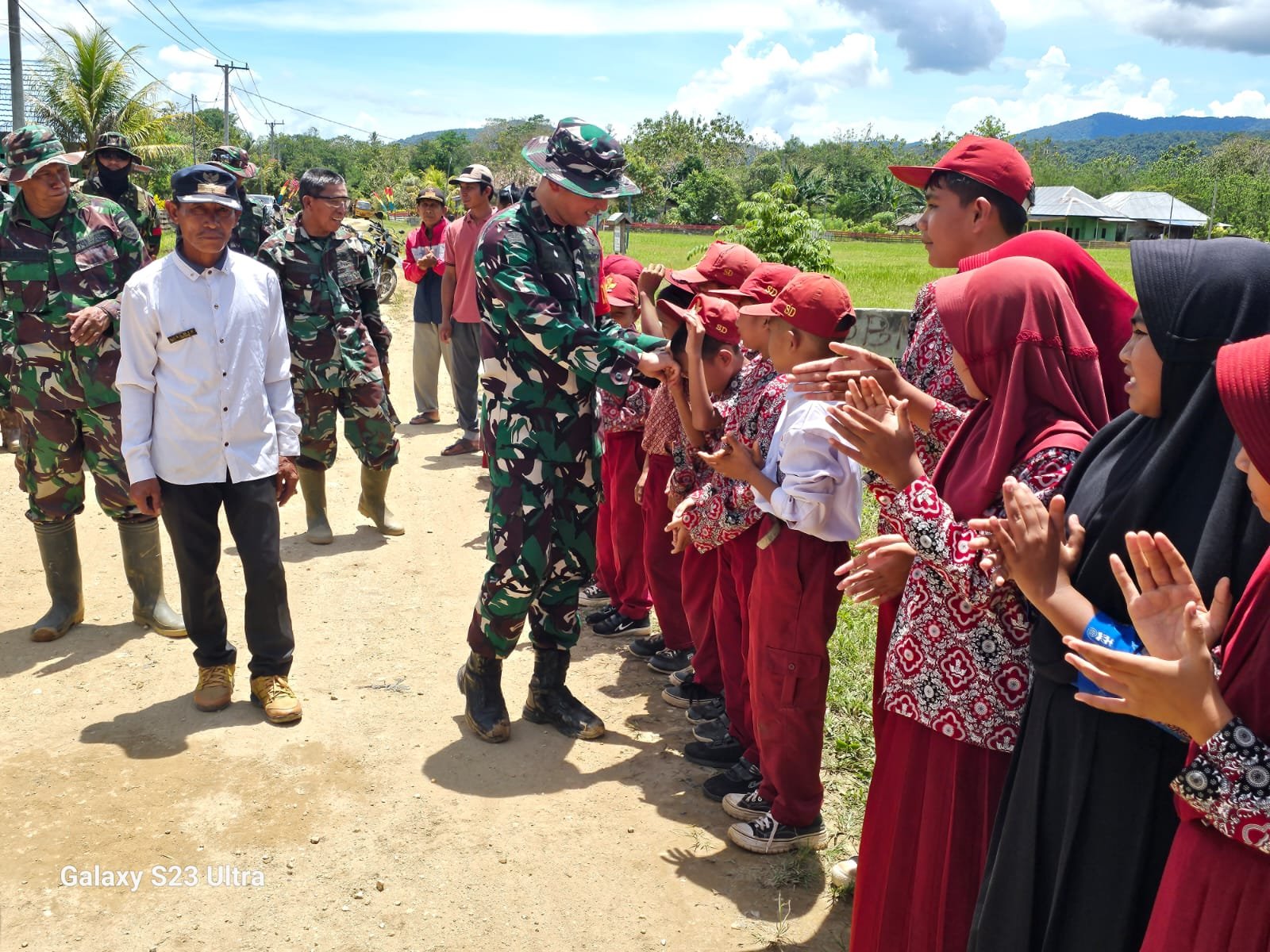 Begitu rombongan Dandim tiba, puluhan anak-anak sekolah dasar yang tengah melintas di sekitar lokasi langsung berlari menyambut dengan senyum dan lambaian tangan. Mereka tampak antusias dan gembira melihat kehadiran para prajurit TNI di desanya.