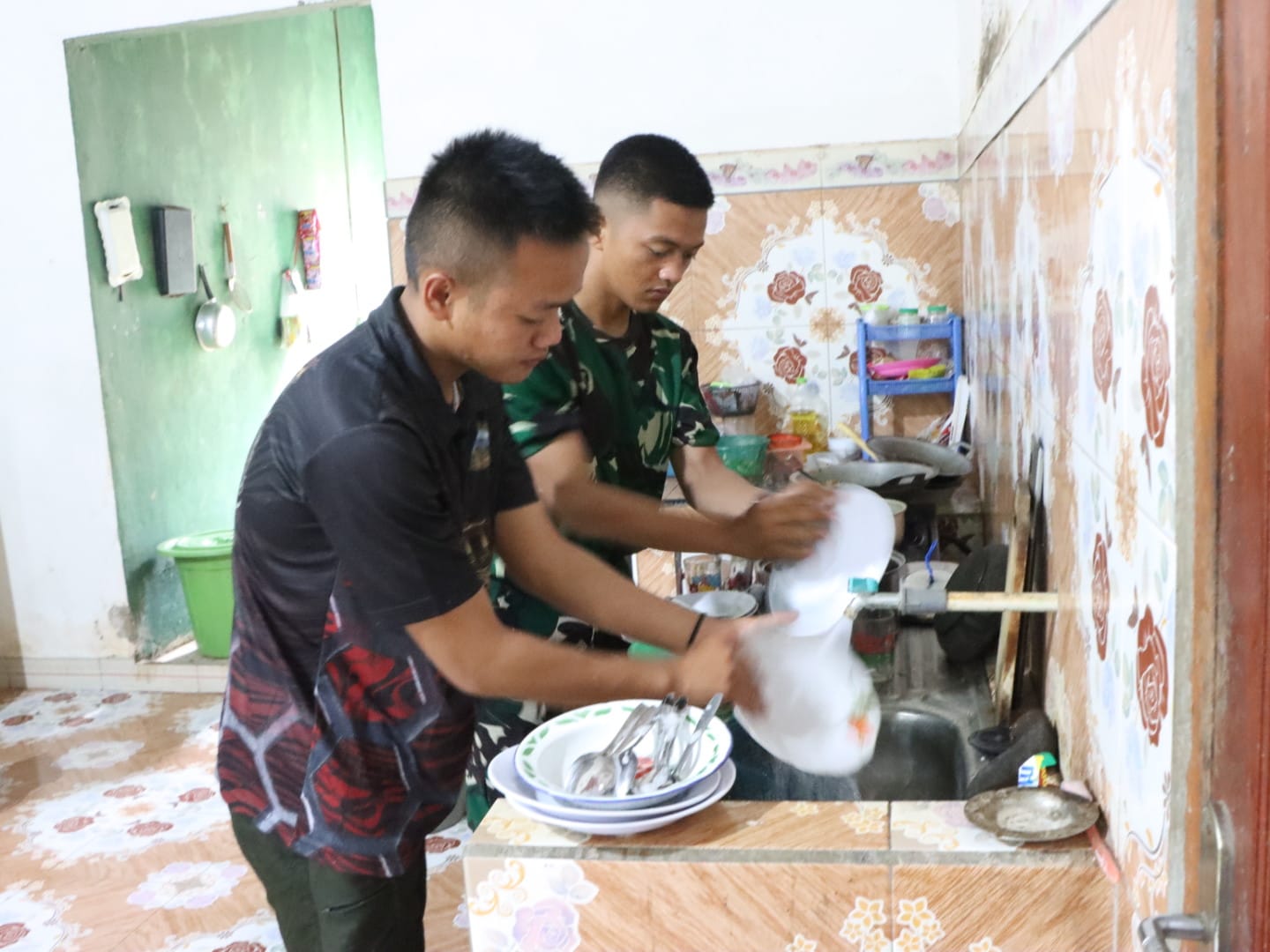 Momen ketika membantu mencuci piring ini juga berfungsi sebagai sarana komunikasi yang santai antara anggota Satgas dan keluarga tuan rumah. Dalam suasana hangat dan penuh canda, terjalin percakapan yang semakin memperkuat hubungan antara keduanya.