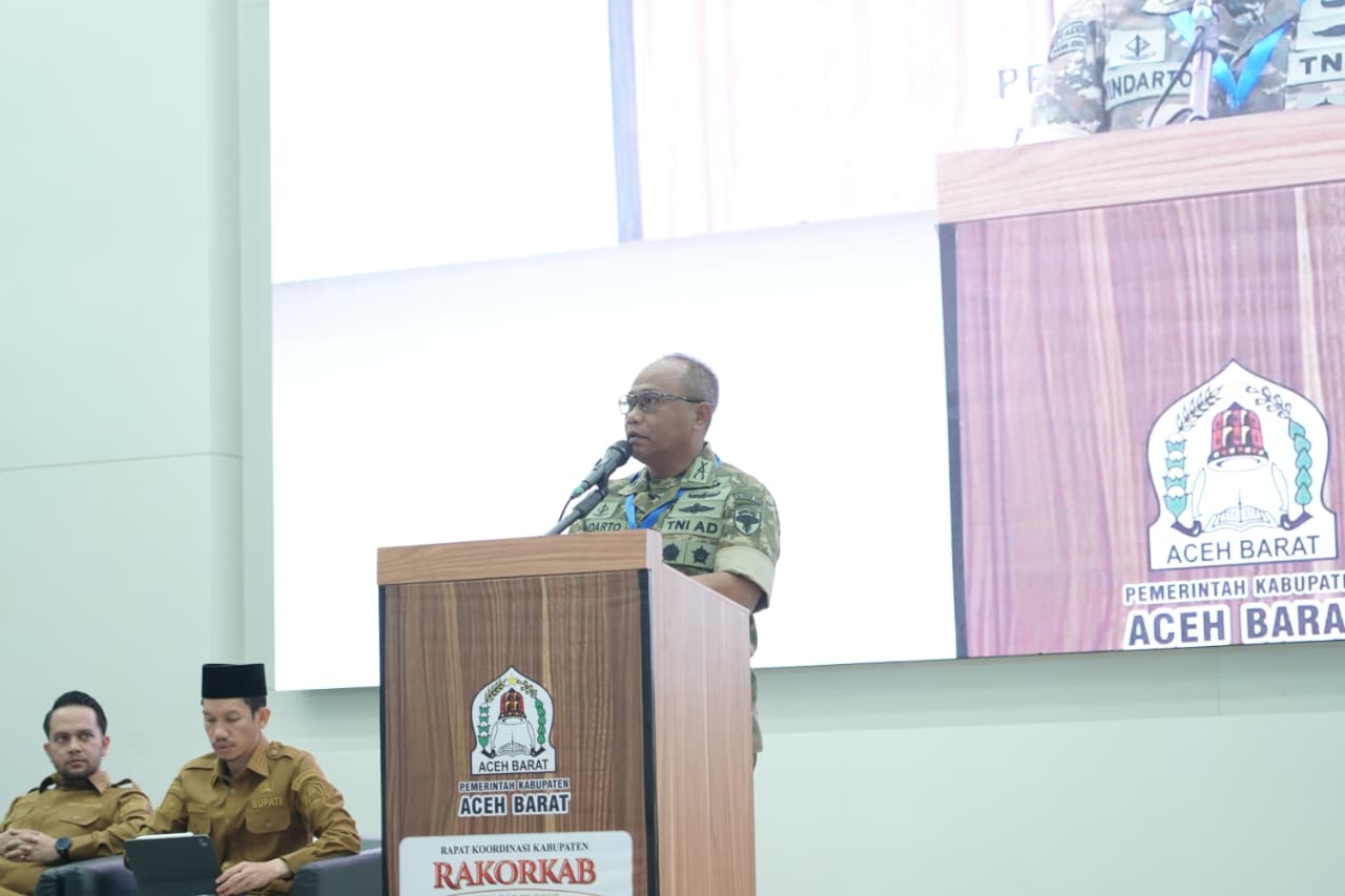 Aceh Barat – Komandan Korem (Danrem) 012/Teuku Umar, Kolonel Inf Windarto, S.Sos., M.M., menghadiri Rapat Koordinasi Kabupaten (Rakorkab) Aceh Barat dengan tema “Sinergi Membangun Aceh Barat yang Maju dan Sejahtera”, yang dilaksanakan di Gedung Auditorium Universitas Teuku Umar, Kamis (12/02/2026).