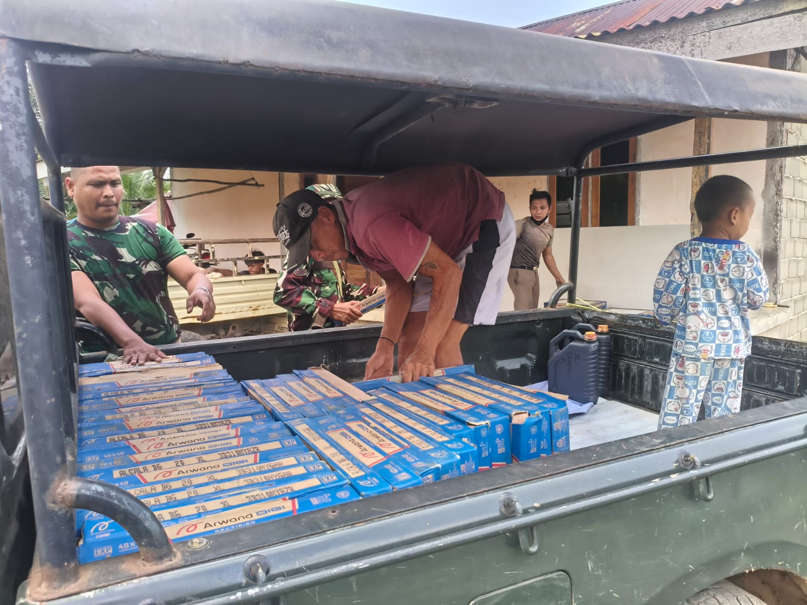 Material keramik tersebut diangkat secara manual menuju lokasi pembangunan rumah yang sedang dikerjakan. Anggota Satgas dan warga terlihat saling bahu-membahu dalam mengangkat dan menata material agar proses pemasangan keramik dapat dilaksanakan secepat mungkin.