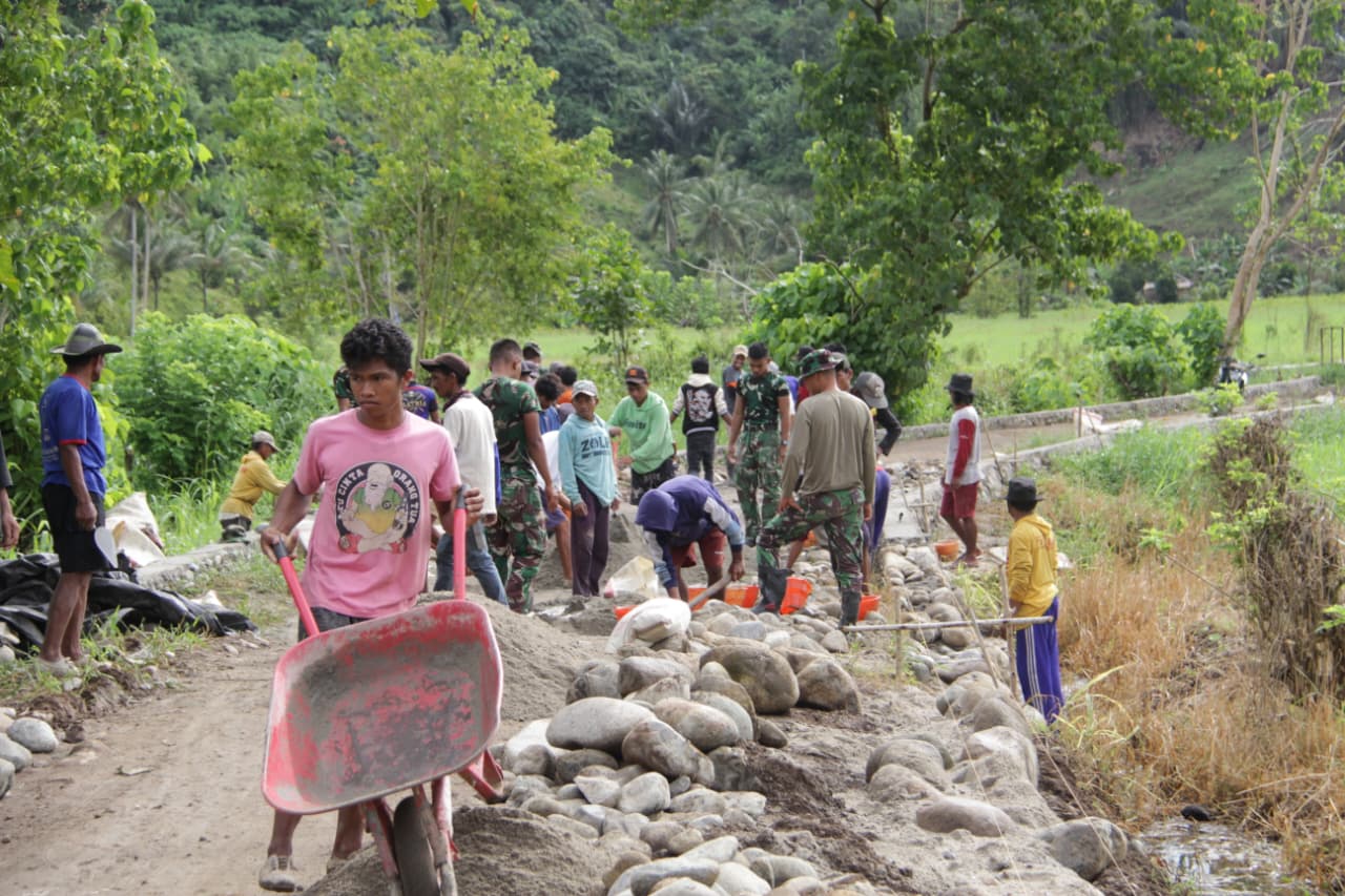 Di lokasi kegiatan, terlihat sinergi yang kuat antara TNI dan masyarakat. Mereka bahu-membahu dalam berbagai tahap pekerjaan, mulai dari pengangkutan material hingga perataan badan jalan dan penyusunan batu untuk talud penahan tanah. Semangat gotong royong mencerminkan kemanunggalan antara TNI dan rakyat, serta merupakan ungkapan nyata dari kerja sama yang harmonis.