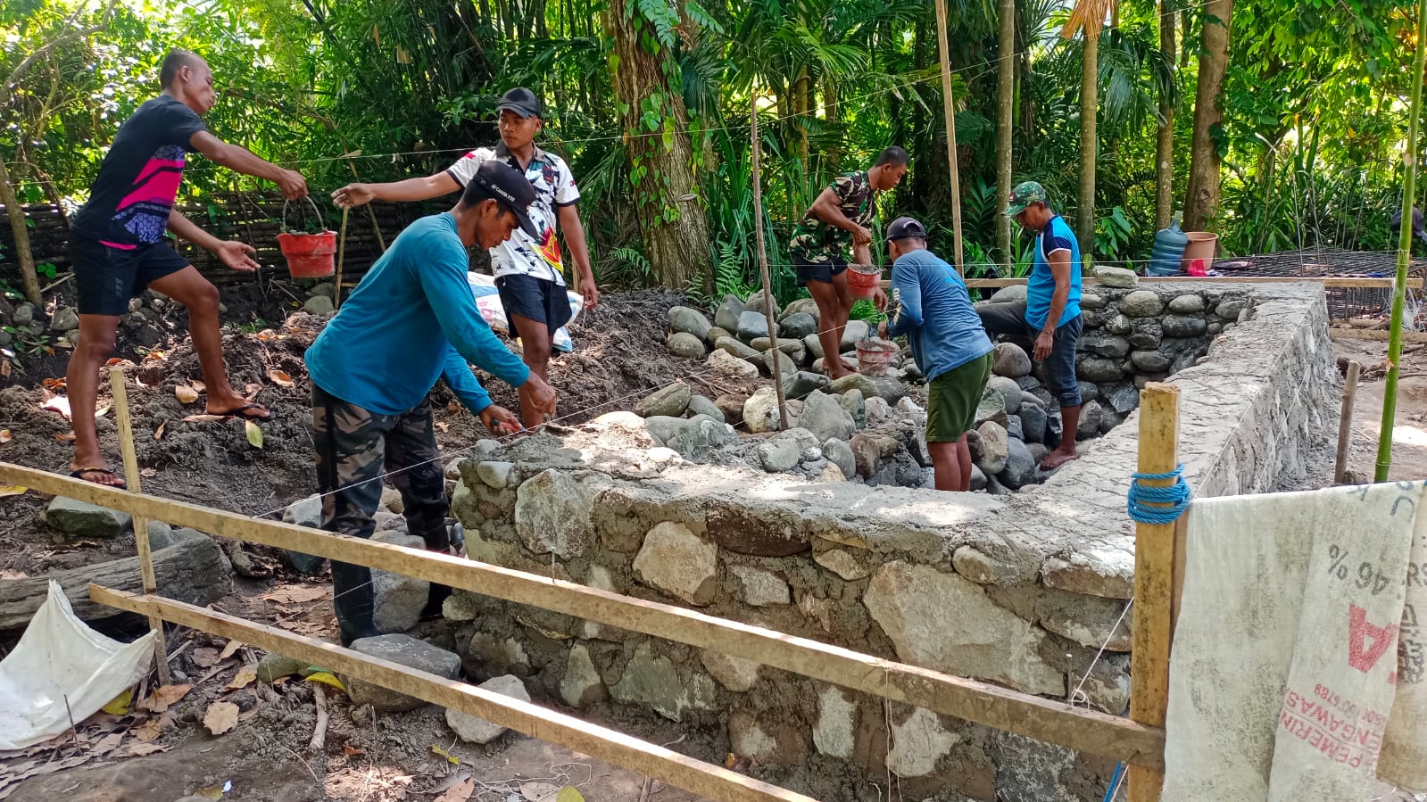Personel TNI bersama warga setempat aktif berkolaborasi dalam merakit rangka besi dan memasang pondasi foot plat di bagian sisi jembatan. Proyek jembatan gantung yang panjangnya direncanakan mencapai 60 meter ini merupakan bagian penting dari tahap awal pembangunan.