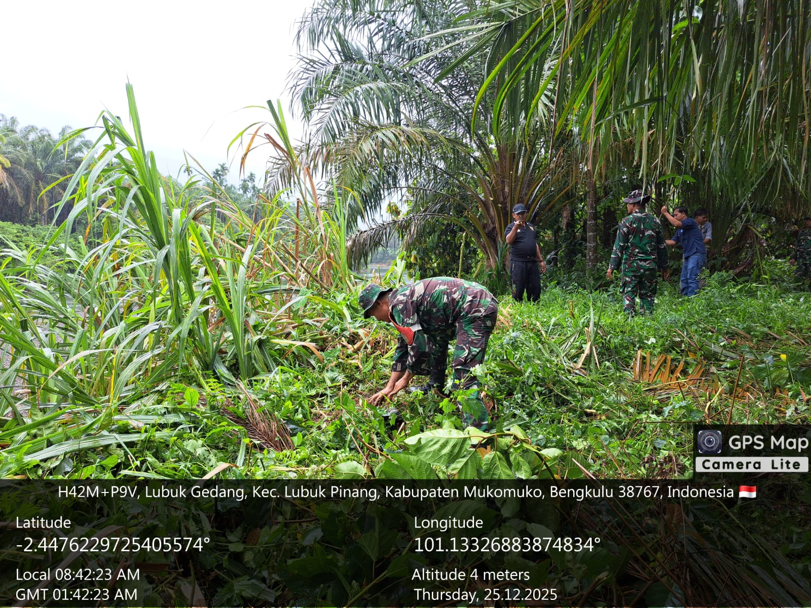 Mukomuko, 25 Desember 2025 – Dalam upaya mendukung pelestarian lingkungan dan menjaga kelestarian sumber daya air, Koramil 428-01/Mukomuko menggelar kegiatan penghijauan di Desa Lubuk Gedang, Kecamatan Lubuk Pinang, Kabupaten Mukomuko. Kegiatan ini berlangsung dari pukul 08.00 WIB hingga selesai, dipimpin langsung oleh Danramil Kapten Inf Desmayontos bersama para Babinsa.