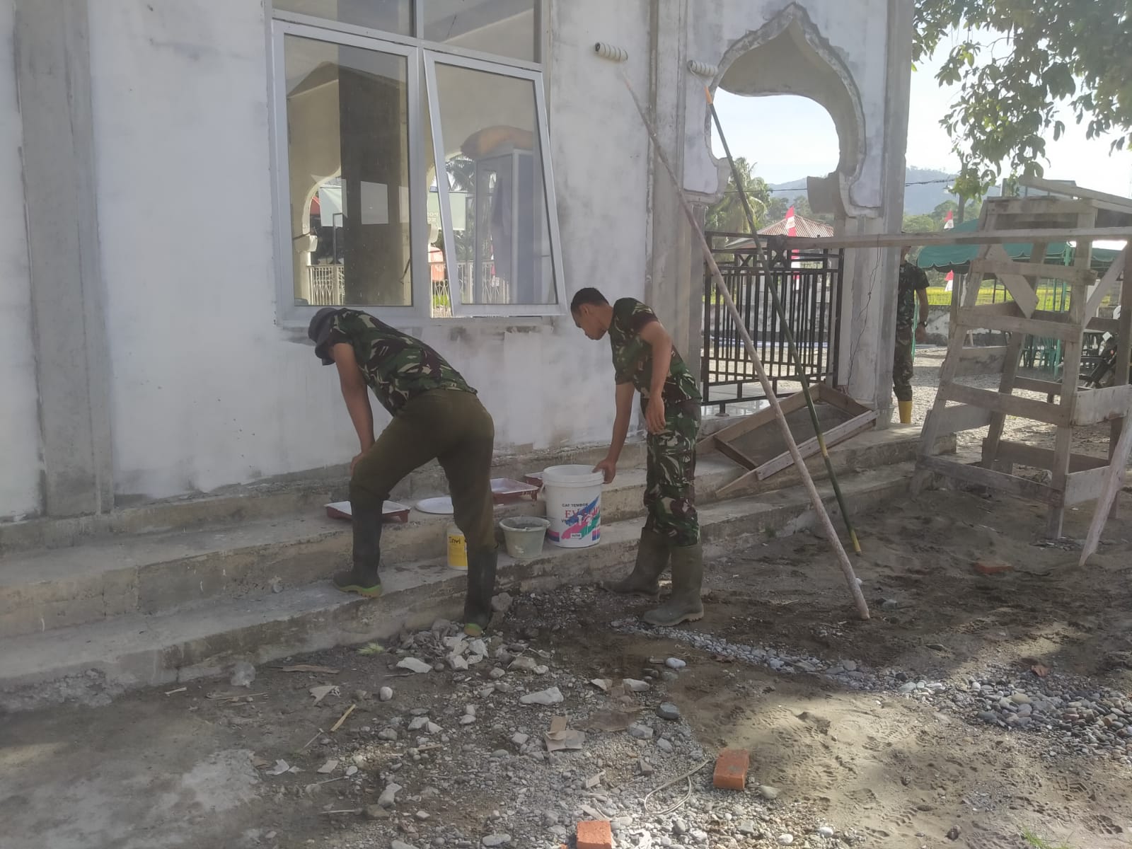 Terlihat para personel Satgas TMMD bekerja dengan penuh ketelitian. Proses pengecatan dilakukan secara bertahap agar hasilnya rapi dan mampu menghadirkan suasana baru yang lebih bersih dan nyaman bagi jamaah.