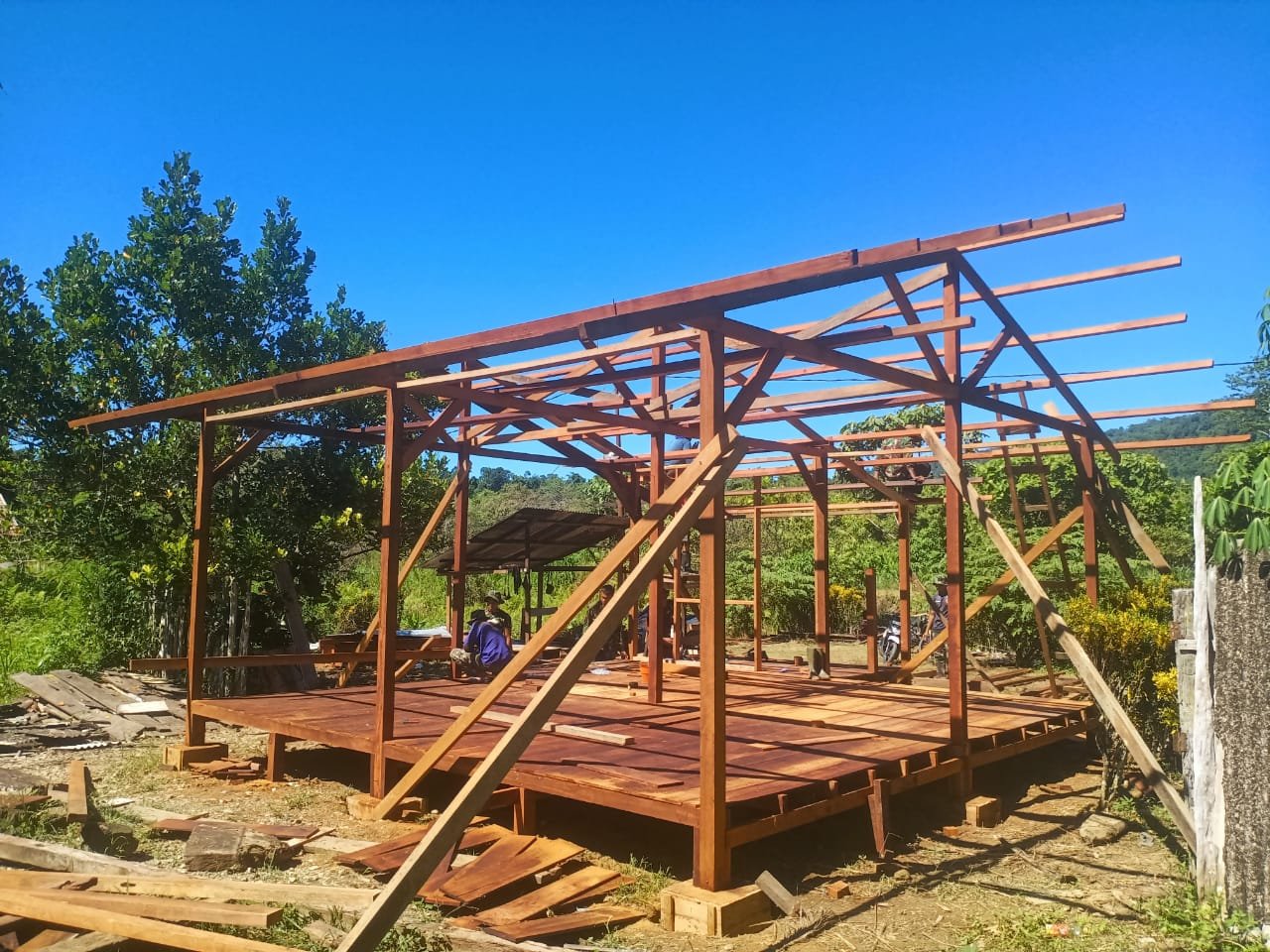 Kerangka rumah menjadi struktur utama yang menandai bentuk bangunan secara keseluruhan. Satgas TMMD bersama warga bekerja sama menyusun dan mengikat kayu dengan sistem penguatan agar tetap kokoh dan stabil dalam jangka panjang, terutama menghadapi kondisi cuaca Papua yang cukup ekstrem.