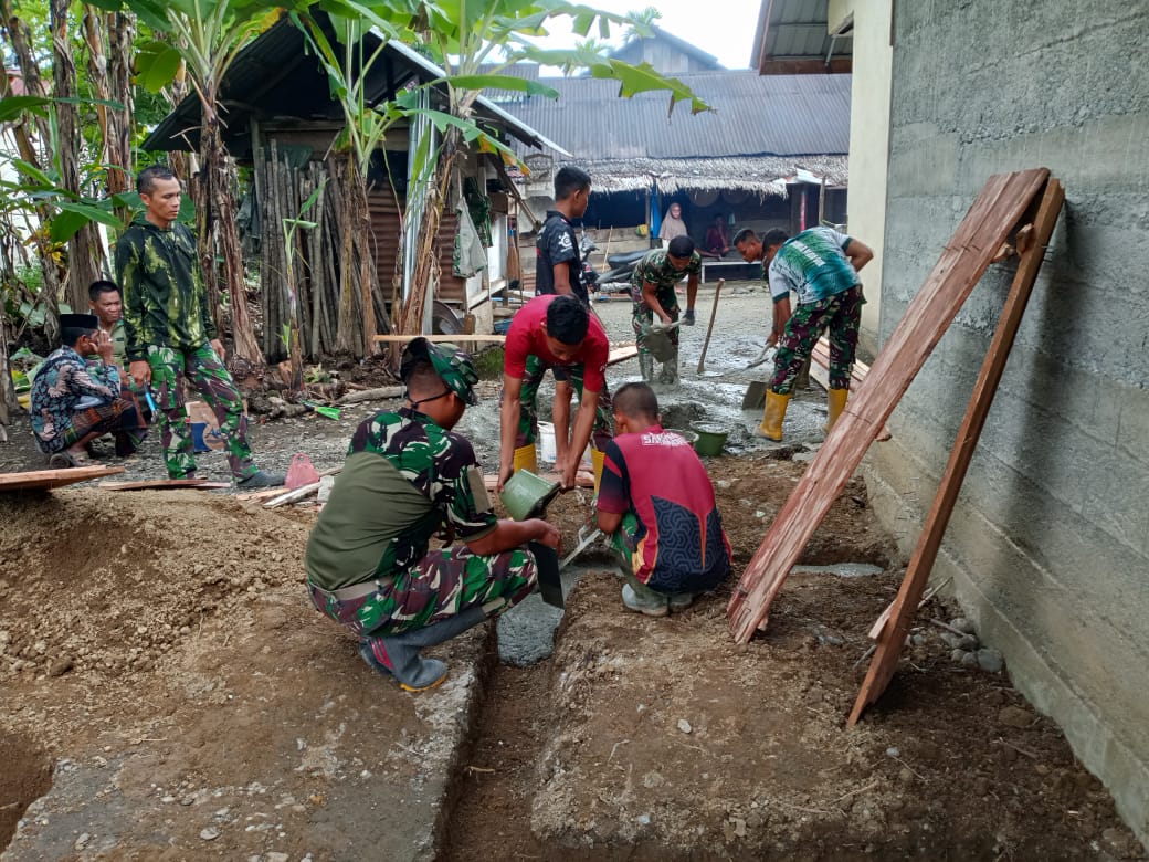 Warga bersama personel Satgas TMMD bahu membahu mengerjakan pembangunan fasilitas Mandi Cuci Kakus (MCK) di tiga titik pembangunan.
