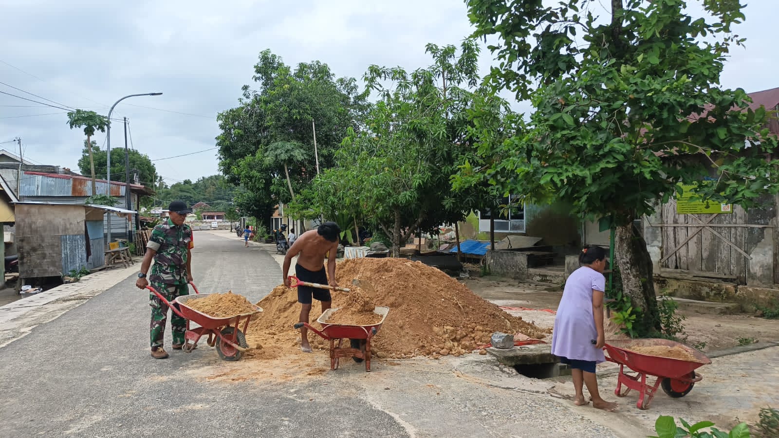 Meskipun terlibat langsung dengan tanah dan pasir, semangat kerja keras pasangan tersebut terlihat jelas saat mereka bersama-sama dengan anggota Satgas mengerjakan tugas mereka untuk mempercepat proses pembangunan RTLH.