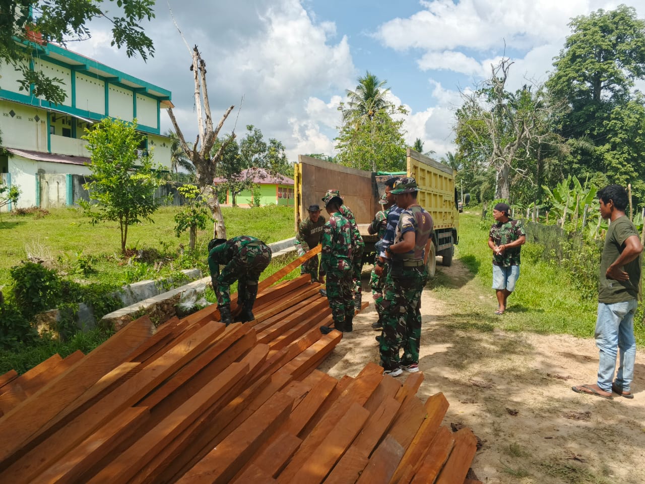 KUTAI TIMUR – Di tengah terik matahari yang menyinari Desa Suka Rahmat, sebuah pemandangan tak biasa menghiasi RT. 08. Ratusan batang kayu kokoh, bahan utama kehidupan baru, mulai berdatangan dan diturunkan dengan semangat gotong royong yang membara. Ini bukan sekadar pengiriman material biasa, melainkan awal dari sebuah keajaiban yang akan mengubah nasib salah satu warganya, Kamis (24/07), menandai sebuah babak baru dalam kehidupan masyarakat di Program TNI Manunggal Membangun Desa (TMMD) Ke-125.