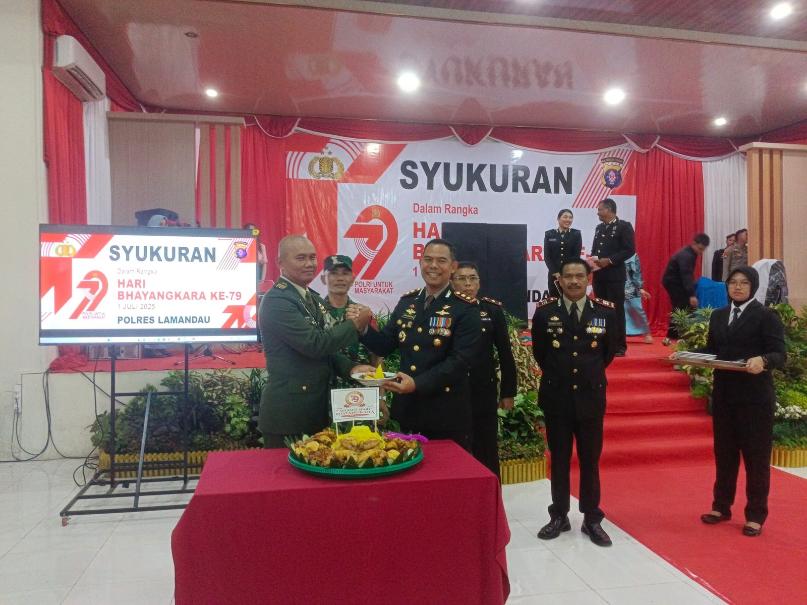 Lamandau, -Dalam suasana meriah peringatan Hari Ulang Tahun (HUT) Bhayangkara ke-79, Kodim 1017/Lmd memberikan kejutan spesial kepada Polres Lamandau. Selasa pagi (1/7/2025), sebuah nasi tumpeng dan iringan musik meriah dari grup musik Zamrud menghiasi Mapolres Lamandau, menciptakan suasana penuh keakraban dan kebersamaan antar instansi penegak hukum di Kabupaten Lamandau.