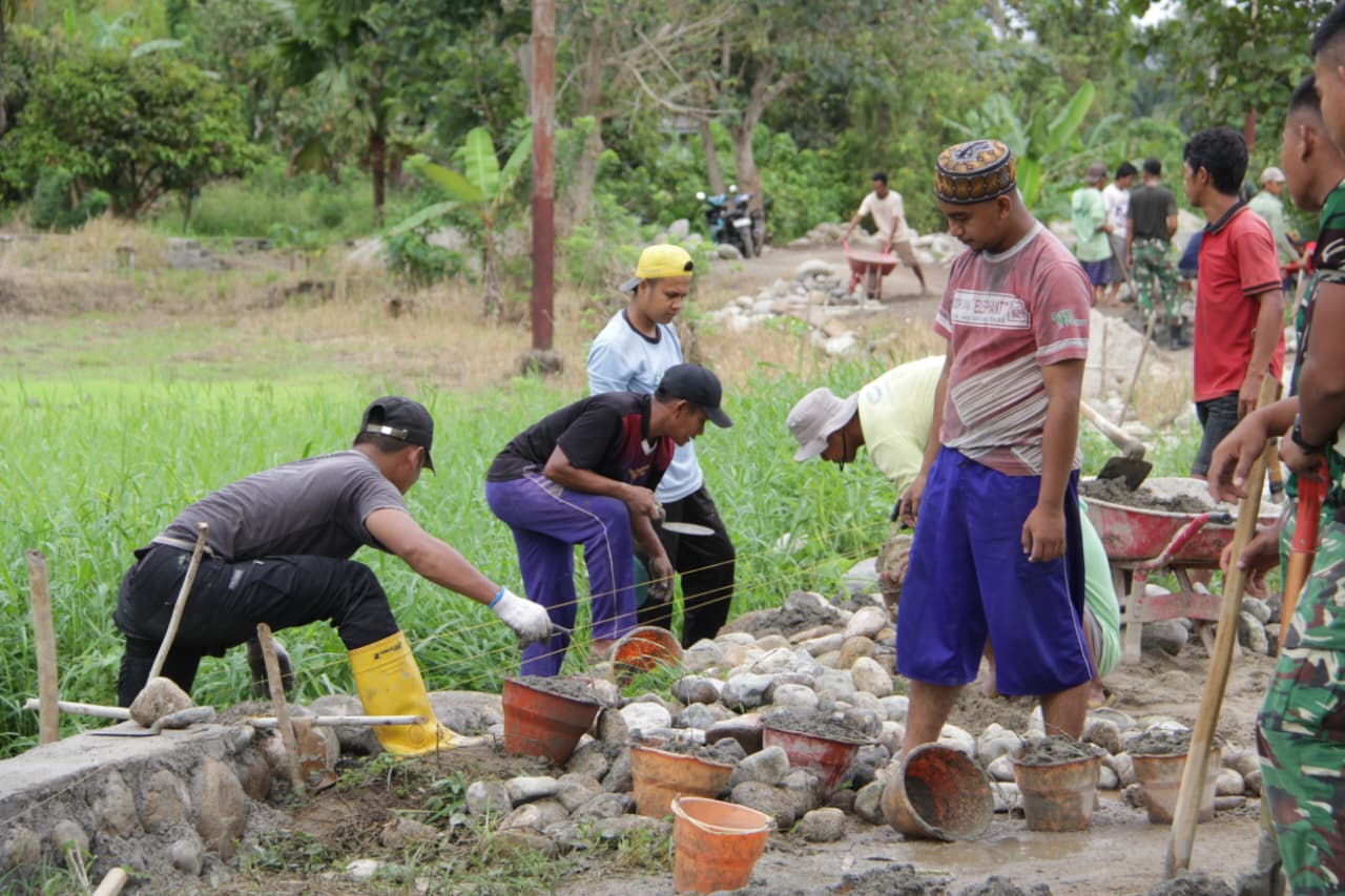 Personel Satgas TMMD berkolaborasi dengan warga lokal dalam gotong royong untuk menyelesaikan proyek ini. Proses pengerjaan mencakup perataan badan jalan, penimbunan material, serta penyusunan batu talud agar konstruksi menjadi lebih kuat dan tahan lama.