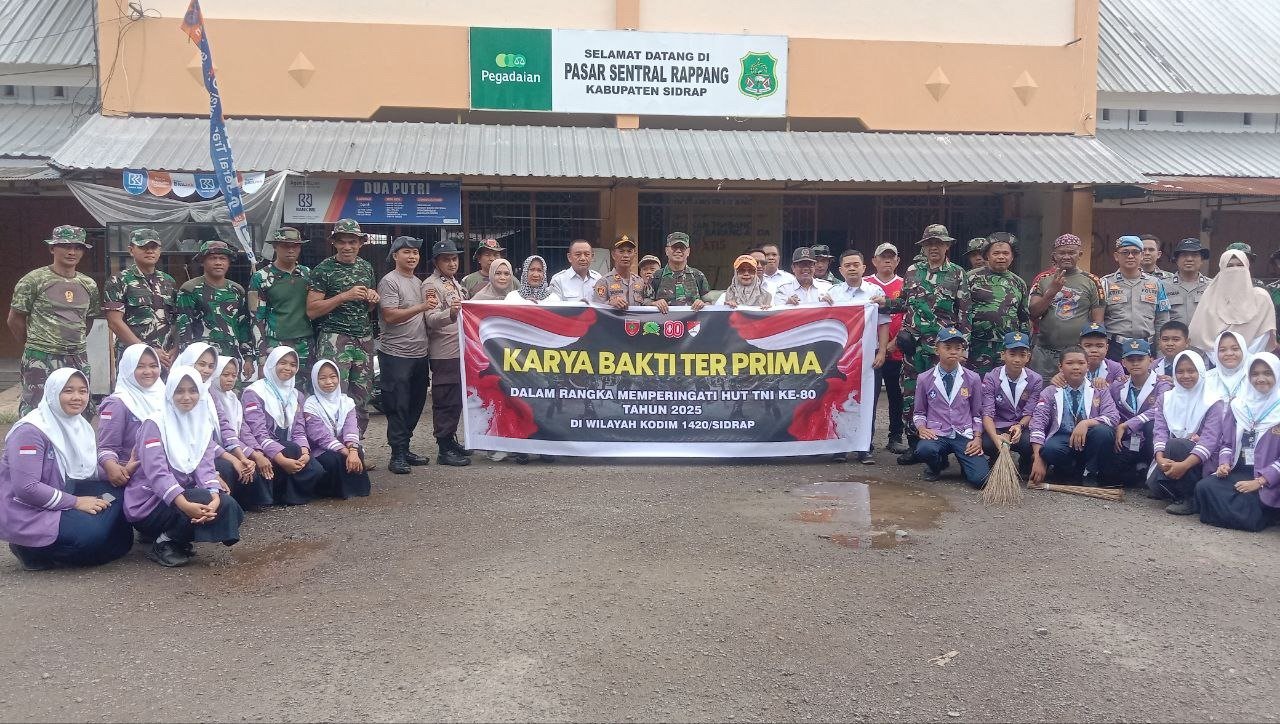 Sidrap, 24 September 2025 — Dalam rangka menyambut Hari Ulang Tahun (HUT) ke-80 Tentara Nasional Indonesia (TNI), Kodim 1420/Sidrap melaksanakan kegiatan karya bakti di Pasar Sentral Rappang, Kelurahan Rappang, Kecamatan Panca Rijang, Kabupaten Sidrap. Kegiatan ini dipimpin langsung oleh Kepala Staf Kodim 1420/Sidrap, Mayor Inf Wahyudi, S.E.