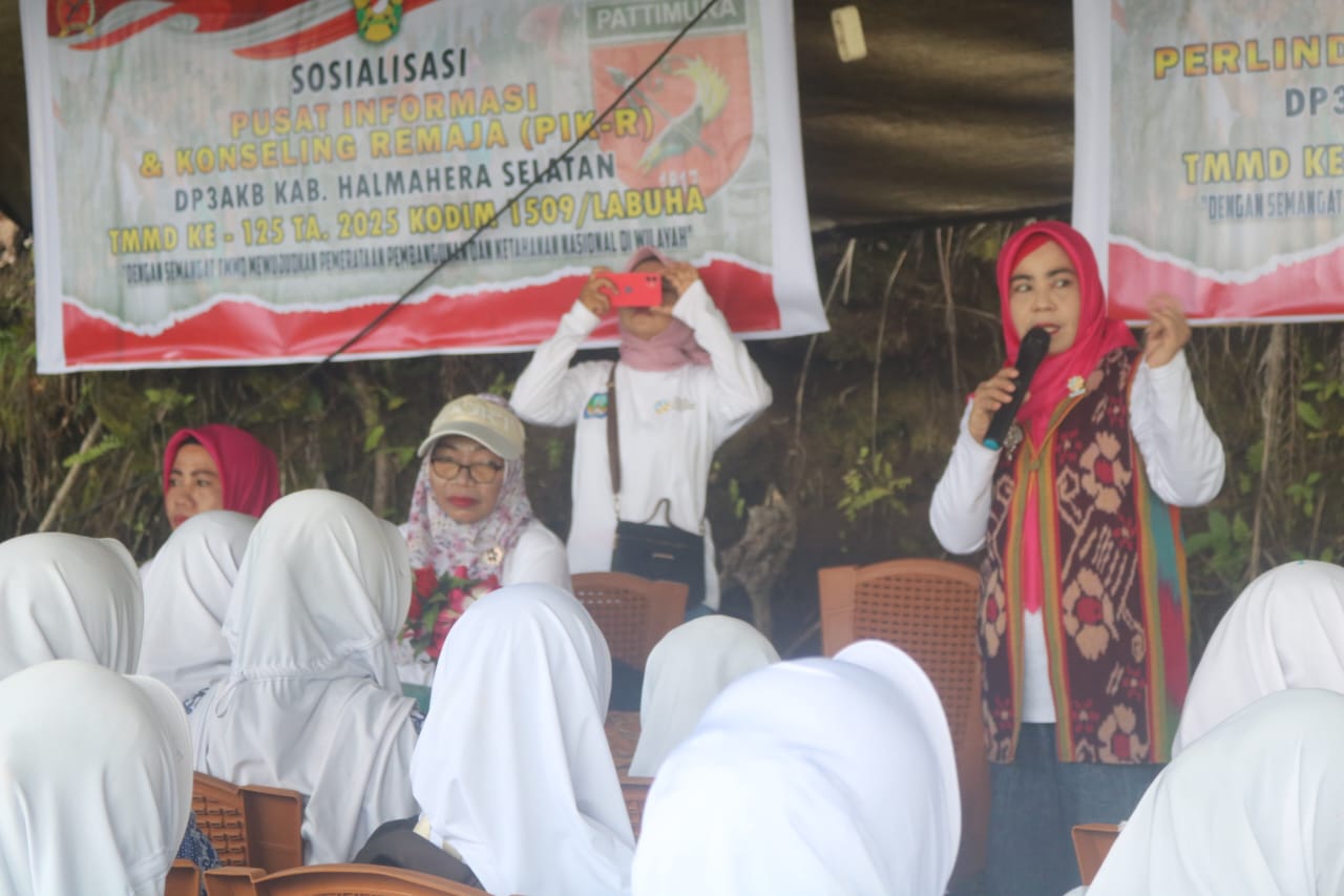 Halmahera Selatan – Kodim 1509/Labuha bekerja sama dengan Dinas Pengendalian Penduduk dan Keluarga Berencana (DPPKB) Kabupaten Halsel mengadakan Penyuluhan Pusat Informasi Konseling (PIK) Remaja dalam rangka kegiatan TMMD (TNI Manunggal Membangun Desa) bagi peserta didik SMAN 11 Halsel dan SMPN 58 Halsel, Rabu (20/08/2025).