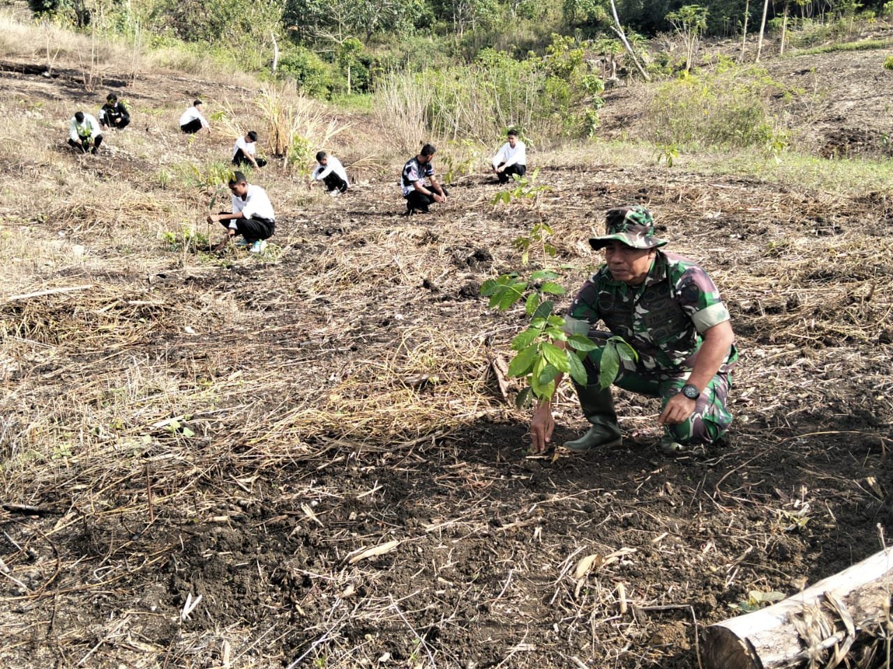 Kegiatan ini melibatkan anggota TNI, pemerintah desa, tokoh masyarakat, serta warga setempat yang dengan antusias ikut serta dalam gerakan penghijauan.