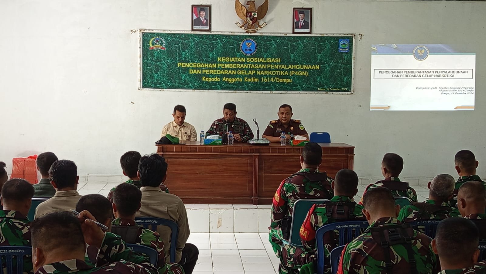 NTB-Dompu,Kodim 1614/Dompu, menggelar sosialisasi Pencegahan Pemberantasan Penyalahgunaan dan Peredaran Gelap Narkotika (P4GN). bertempat di aula Makodim Jln.A. Yani, Kelurahan Dorotangga, Kabupaten Dompu.