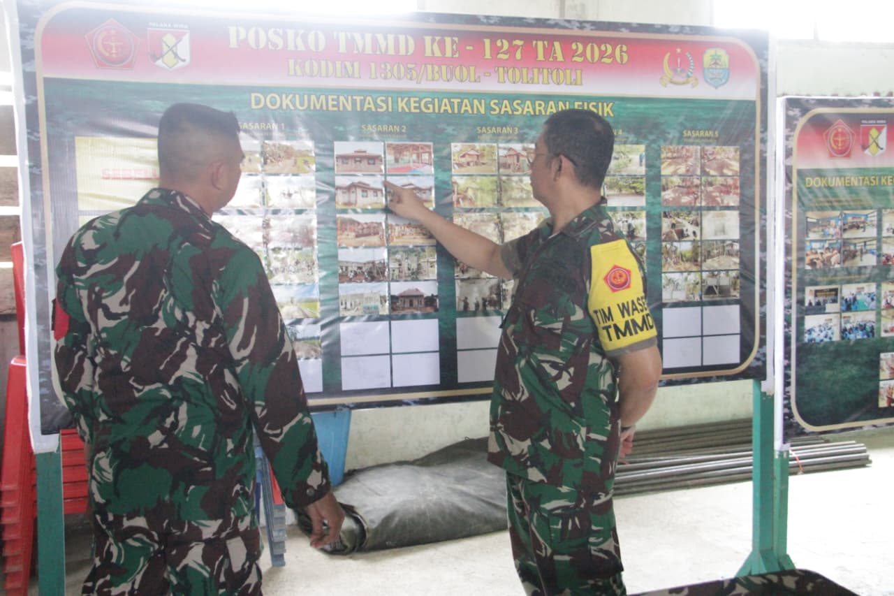 Tolitoli – Kolonel Inf Hadi Purwosubroto, selaku Ketua Tim Wasev TMMD ke-127, melakukan inspeksi langsung terhadap kesiapan Posko TMMD yang terletak di Desa Oyom, Kecamatan Lampasio, Kabupaten Tolitoli pada Rabu (4/3/2026). Kegiatan ini bertujuan untuk memastikan bahwa sarana dan prasarana posko dalam keadaan optimal, sehingga dapat mendukung operasional kegiatan seperti administrasi, laporan harian, serta sistem koordinasi di lapangan.