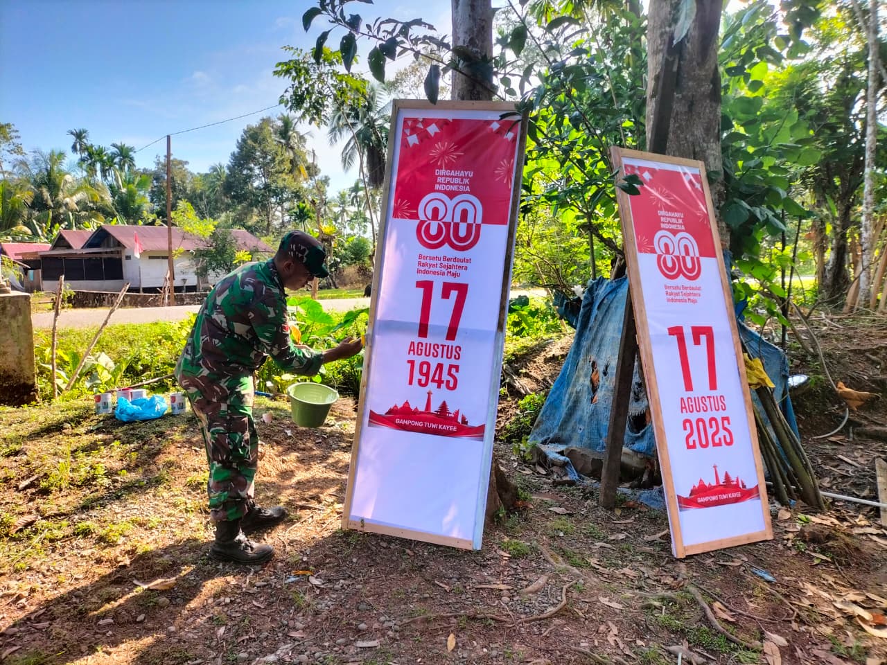 ACEH JAYA – Dalam rangka menyambut dan memeriahkan Hari Ulang Tahun (HUT) ke-80 Kemerdekaan Republik Indonesia, Babinsa Koramil 05/Panga Kodim 0114/Aceh Jaya, Koptu Izrillah, turut serta aktif membantu warga Gampong Tuwi Kayee, Kecamatan Panga, Kabupaten Aceh Jaya, Kamis (14/08), dalam menghias gapura menyambut hari bersejarah bangsa Indonesia. Kegiatan gotong royong ini menjadi wujud nyata kemanunggalan TNI bersama rakyat dalam semangat kebersamaan.