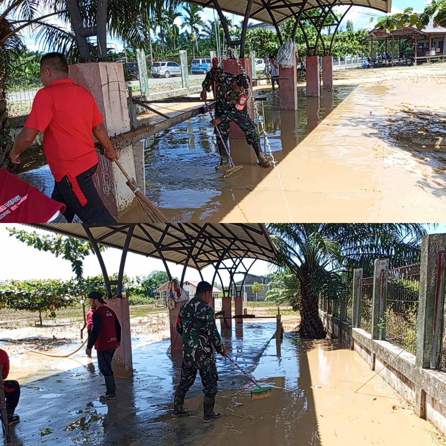 ACEH BARAT — Anggota Koramil 08/Arongan Lambalek Kodim 0105/Aceh Barat bersama warga Desa Simpang Peut dan para guru SMKN 01 melaksanakan gotong royong pembersihan lingkungan sekolah pasca banjir di Kecamatan Arongan Lambalek, Kabupaten Aceh Barat, Kamis (04/12/2025).