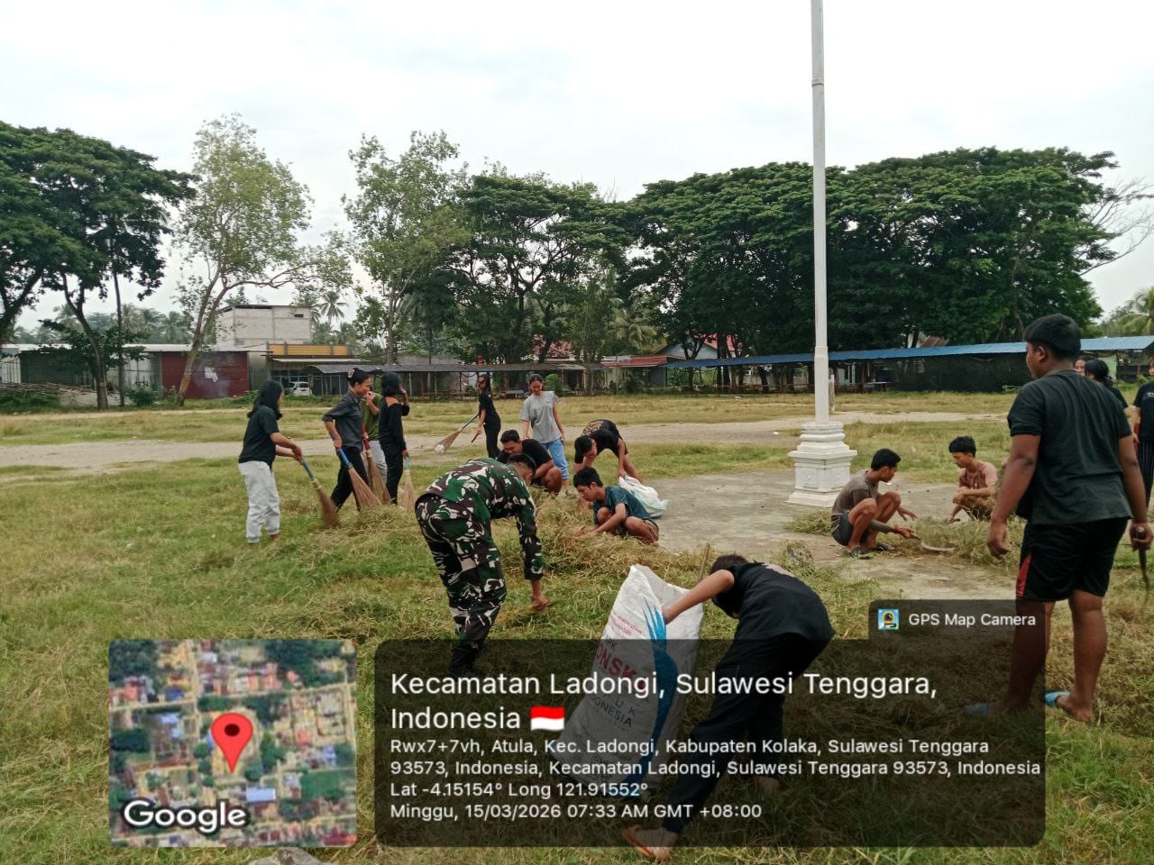 Kolaka Timur – Dalam upaya menjaga kebersihan lingkungan sekaligus mempererat tali persaudaraan dengan masyarakat, Babinsa dari Koramil 1412-01/Tirawuta, Serda Mansur, melaksanakan kegiatan karya bakti (Karbak) bersama para pemuda di Kelurahan Atula. Kegiatan ini berlangsung di Lapangan Kelurahan Atula, Kecamatan Ladongi, Kabupaten Kolaka Timur.