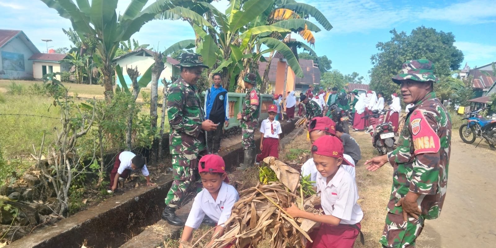 TAKALAR – Personel Koramil 1426-01/Polut Kodim 1426/Takalar, mengajak Siswa Siswi SD Negeri Nomor 51 Lauwa melaksanakan kegiatan kerja bakti bersihkan selokan dan bahu jalan yang banyak ditumbuhi rumput liar di Desa Kampung Beru, Kecamatan Polongbangkeng Timur Kabupaten Takalar. Senin, 28/07/2025.